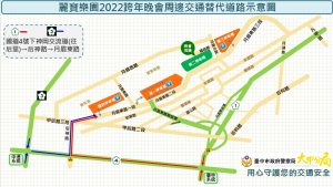 在往麗寶樂園行駛路線部分,由國道1號后里交流道往外埔方向下匝道路段易壅塞回堵,建議民眾如由行駛國道1號,可於國道1號臺中系統接國道4號,下國道4號神岡交流道接后神路、月眉東路一段至跨年活動會場;另行駛國道3號車輛,可於國道3號中港系統接國道4號,下國道4號神岡交流道同樣由后神路、月眉東路一段到活動會場。離場時,亦可利用后神路,由國道4號神岡交流道轉國道1或3號返家,可避開車潮,節省寶貴的時間。另活動會場停車部分,請將愛車停放麗寶樂園停車場,並應注意勿違規停放於周邊道路,將派員加強交通取締。