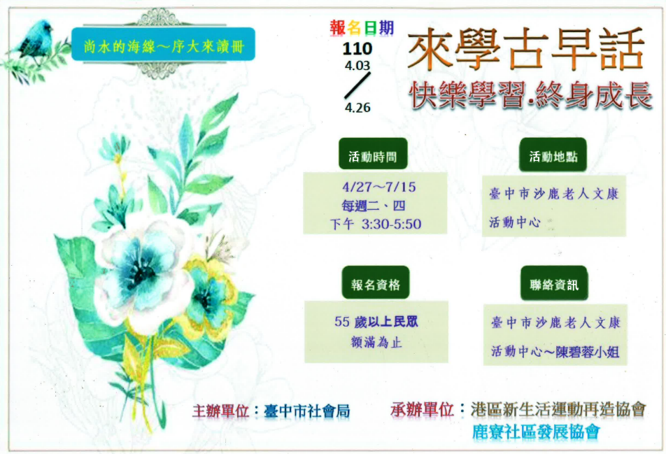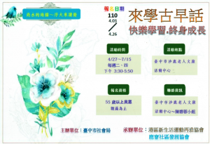 本著這樣的精神,港區新生活運動再造協會每年都會推出課程讓高齡者參與。今年課程包含了體能促進,生命探索以及多元學習三個方面,藉由專業的師資與志工人才陪伴高齡者一起在體能,生命與創新方面進一步學習,讓高齡者可以跟上時代的腳步,高齡者不僅可以增進體能、人際及社會互動之餘,享受健康及充實的退休生活。