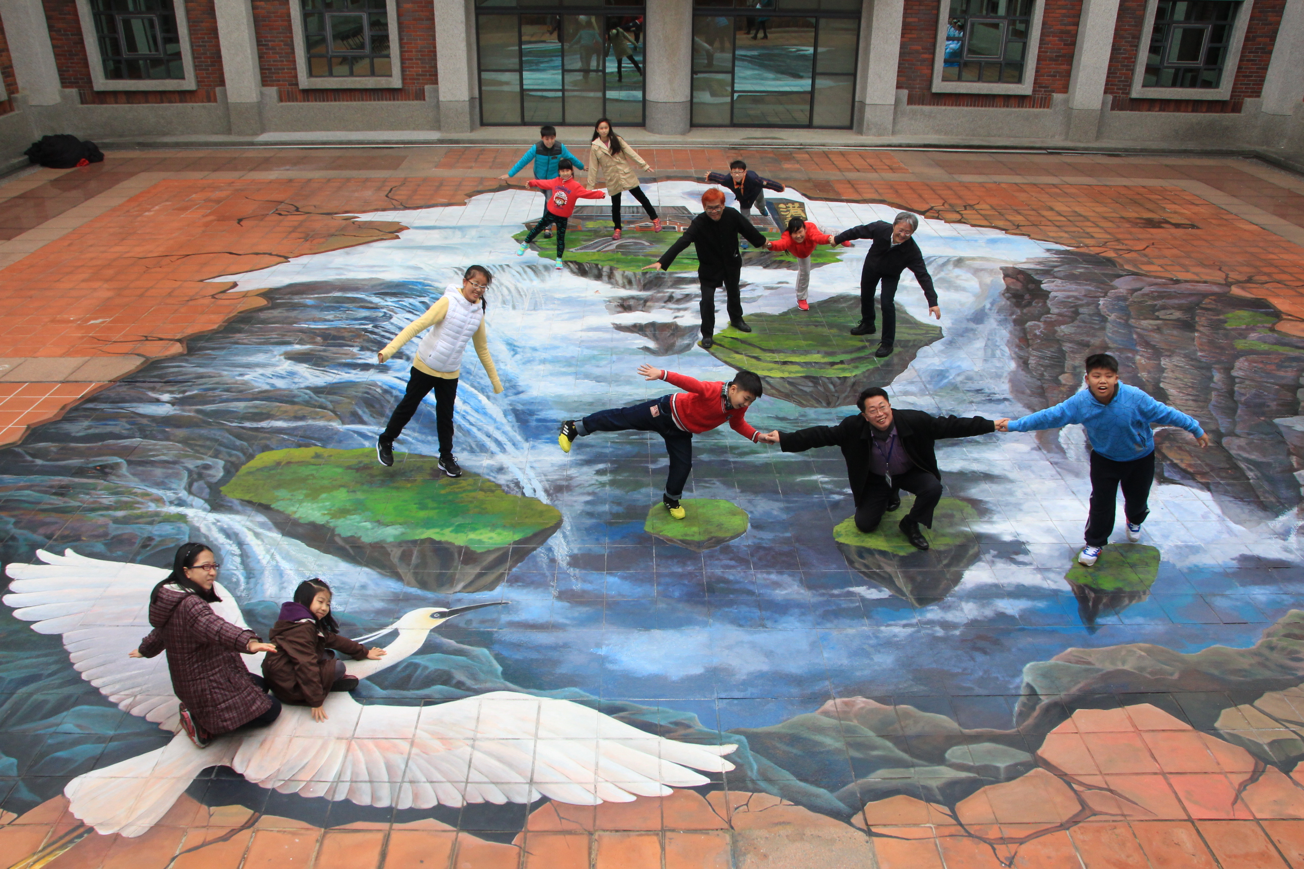 港區藝術中心有鑑於天井廣場四周雖有優雅的建築物環繞,卻因無特殊主題作為參觀景點,長期以來始終是民眾較少駐足的區域,為讓中心空間更充滿活力與想像,特與台灣師範大學美術學系莊連東老師及其團隊合作,設計大幅3D藝術彩繪,透過空間再利用,讓民眾體驗與3D彩繪的互動樂趣,港區藝術中心也精心設計許多最佳拍照的角度,在3D的立體效果下,民眾可以乘坐在白鷺鷥上飛翔,站在浮島上相互救援,漂浮於仙境中遨遊,彷彿身歷其境。