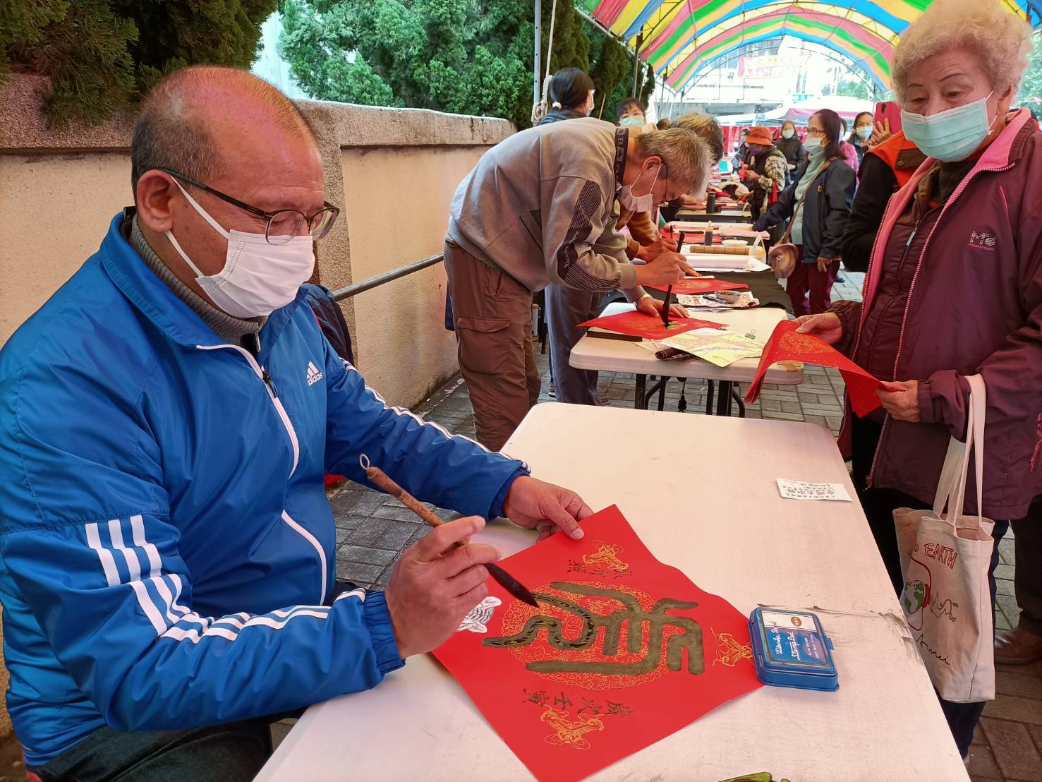 活動九點開始,但一早服務處已大排長龍,人龍綿延到停車場;排到第一號的太太說:「今年第一次參加,擔心沒排到,所以提早!」今年排隊隊伍中出現不少年輕人,他們有的是父母交待來排隊,也有表示自家也想貼春聯;排隊一小時的林先生說:「等待很值得,因為書法春 聯比印刷的更持久!」