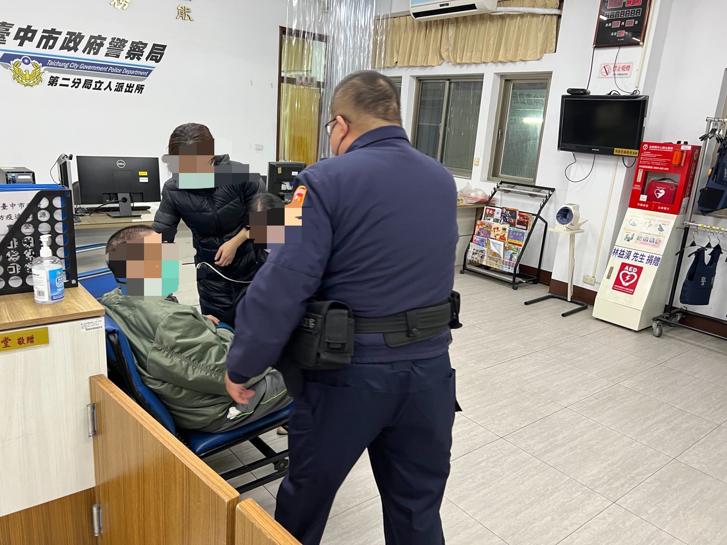 大年初三凌晨12時許中市警第二分局立人派出所警員周錦賢、施宗樺接獲民眾報案,稱一名陌生的老翁一直在門外敲門、按電鈴,懷疑是迷失老人而報警協助,警方到場時老翁仍持續敲著該戶人家鐵門,員警立即阻止他的敲門動作,但他身上未攜帶任何證件或可供辨識的資訊,只喃喃自語說著要「找女兒」、「住在惠X中學」,但該中學距離報案位置有段距離,眼看天氣寒冷,員警趕緊帶他回所及查證身分,一番折騰,原來妻女也在尋找他,而他深夜在外遊蕩,原來是要拿錢給女兒,幸好一家平安團圓,老翁妻女不斷感謝警方的協助。
