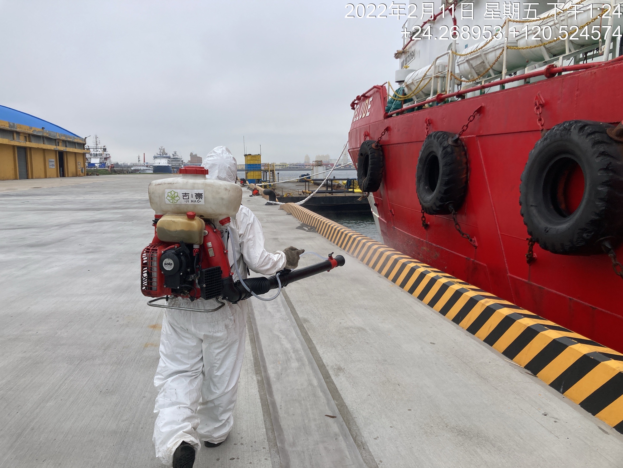 台中港務分公司昨日上午接獲通報,立即召開緊急防疫應變會議,並展開全面消毒作業,針對十七號碼頭一帶及沿線到管制站加強環境消毒。