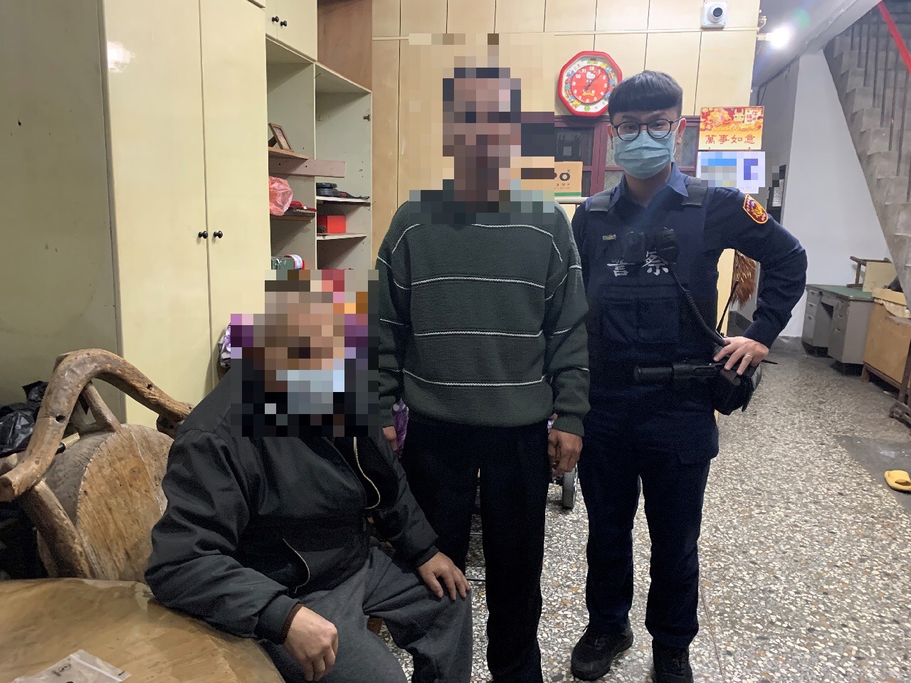 霧峰警分局成功派出所警員鐘國鴻、簡佑軒於日前接獲民眾電話報案,稱在大里區泉水街附近有一名年約六旬的老人身穿黑色夾克、穿棉長褲手持拐杖,不知道如何回家,希望警方協助。