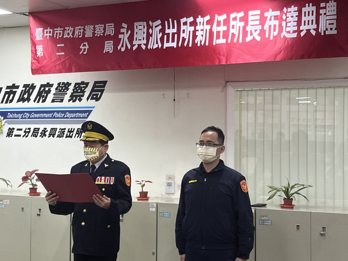 中市警察局第二分局永興派出所卸、新任所長布達交接典禮,市議員陳政顯、陳文政、多位里長及協勤民力幹部等貴賓蒞臨觀禮,由分局長陳家銘親臨主持,一方面除對新任所長榮膺新職表達祝賀外,同時也對各位來賓在百忙當中撥冗觀禮,表示由衷的感謝,並歡迎新任所長到任,給予肯定祝福,眾人一致期許新任所長對地方治安工作持續努力。