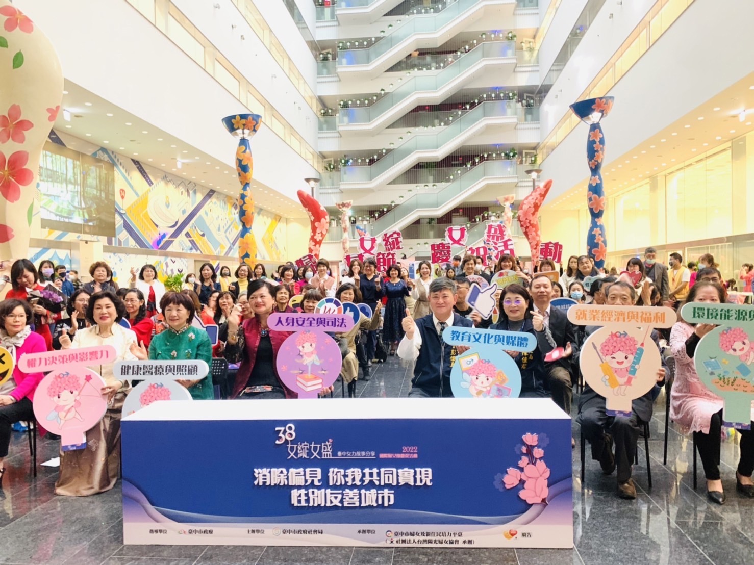慶祝38國際婦女節,臺中市政府社會局委託社團法人台灣陽光婦女協會,於今日舉辦「女綻女盛-女力故事分享記者會」,邀請性別政策綱領六大面向中勇於突破框架、表現傑出的38位女力代表,和大眾分享生命故事。社會局局長彭懷真頒贈38位偉大女性感謝狀,並送上玫瑰花,呼應1908年紐約婦女遊行口號「麵包與玫瑰」,期待女性成為家庭支柱的同時,也可以擁有自己的生活。