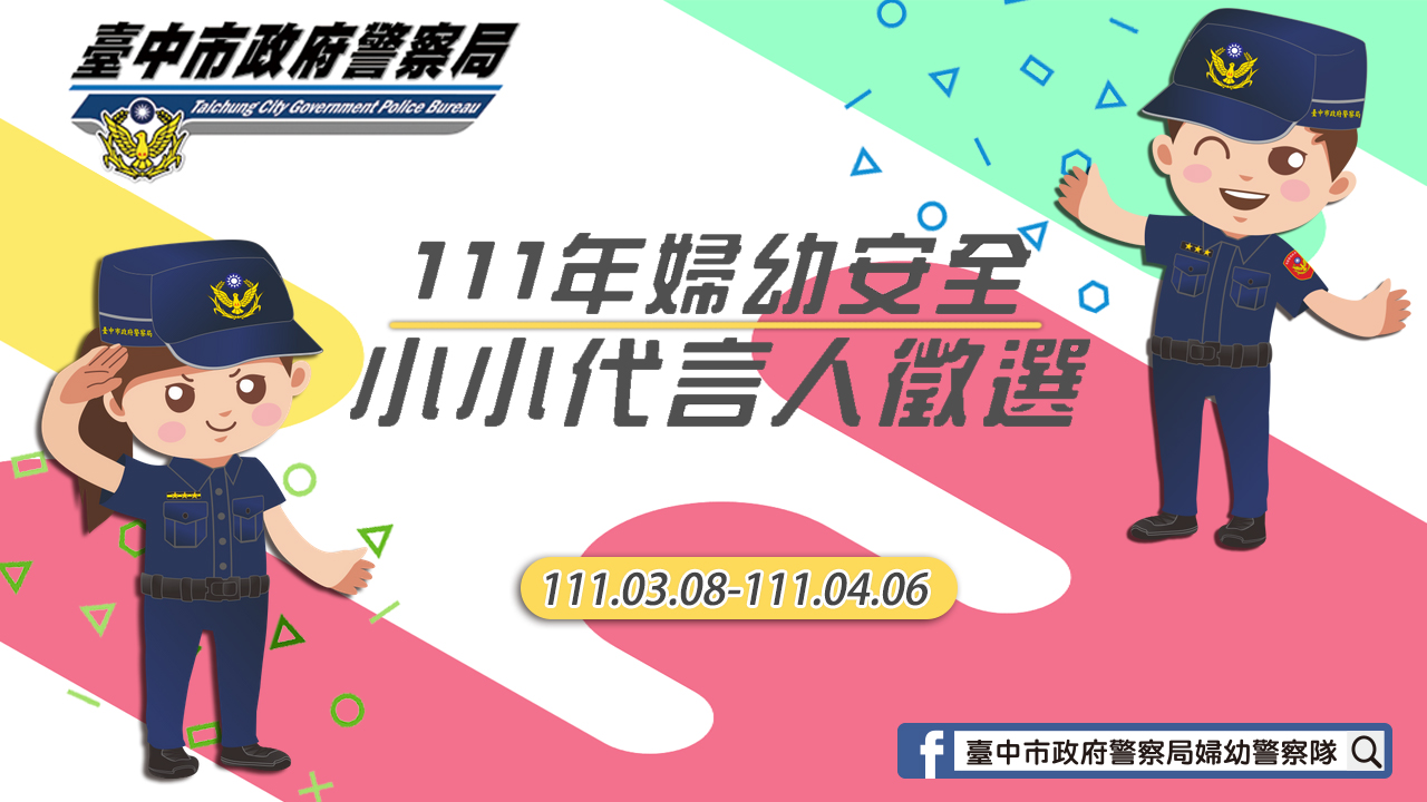 中市警局「婦幼安全小小代言人」徵選活動期間自111年3月8日(星期二)9時起至4月6日(星期三)24時止,預計111年4月7日(星期四)公布得獎名單。