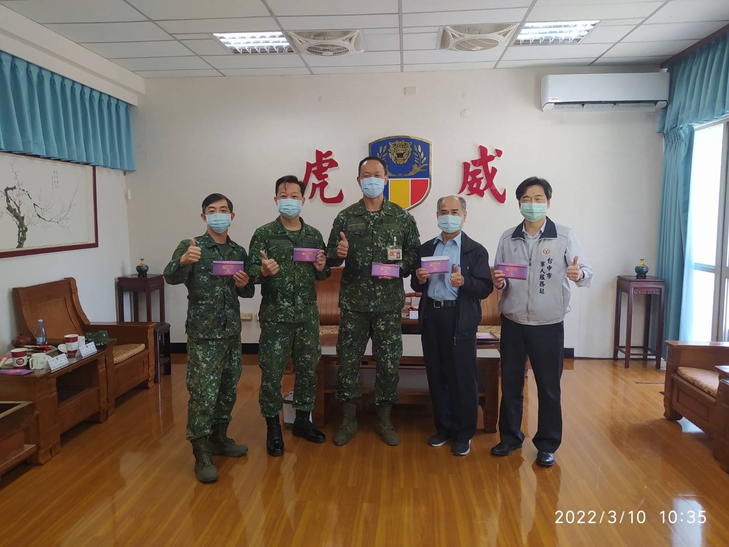 為感念國軍官兵長期以來戮力戰訓任務及負擔保家衛國之重任,臺中市萬代福影城黃炳熙總裁本(3)月10日特別由軍人之友社台中市軍人服務站張景森站長陪同前往成功嶺營區慰問陸軍第302旅、陸軍第104旅、中區後訓中心及替代役訓練班致贈敬軍電影票,分別由陸軍302旅旅長傅上校、陸軍104旅政戰主任黃上校、中區後訓中心主任李上校及替代役訓練班班主任蔡執行祕書等親自接待,並轉發給各單位國軍官兵免費觀賞使用,提供國軍官兵們正當休閒的好去處,各單位長官都非常感謝黃總裁的敬軍熱誠與心意。