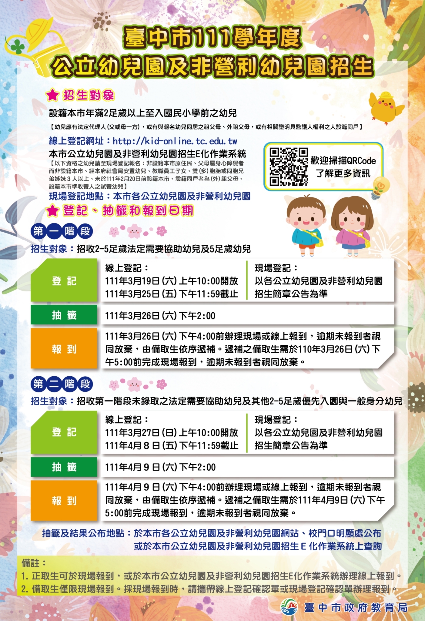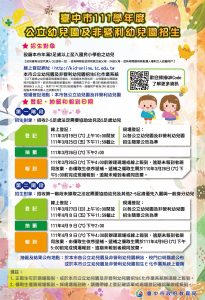 市府表示,「公幼倍增」政策透過既有空間增班或新設國小附幼及增設非營利幼兒園的方式,108至110年已增班162班,即將達成增班180班目標,大幅減輕家長的困擾和負擔。4所幼兒園招生簡章公告於台中市政府教育局網站( https://www.tc.edu.tw/ 關鍵字搜尋:非營利幼兒園招生簡章),網路報名登記時間3月19日上午10時至3月25日晚間11時59分,家長亦可依簡章公告日期及地點採現場報名;符合線上登記條件的家長可直接進入「台中市公立幼兒園及非營利幼兒園招生E化作業系統」報名頁面( http://kid-online.tc.edu.tw ),直接填寫報名幼兒基本資料與聯絡人方式後,系統將自動比對是否符合幼兒園報名資格,不需另外準備現場報名紙本資料。