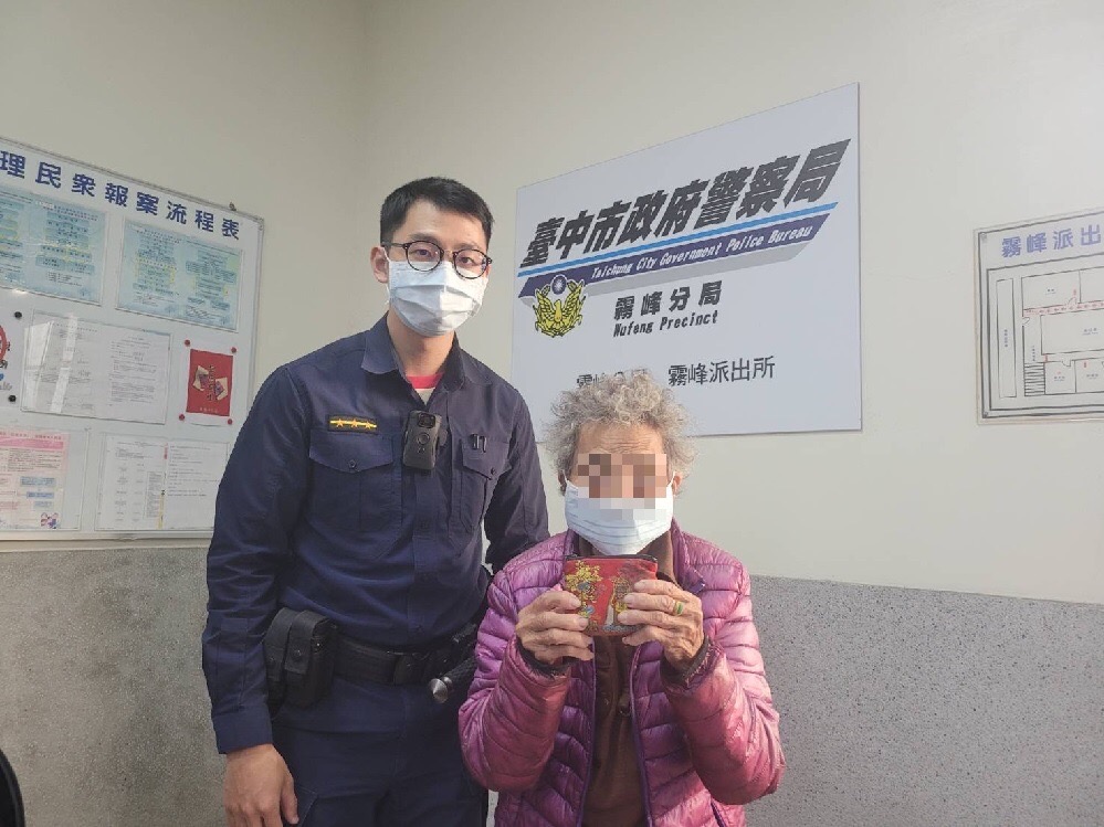 霧峰分局霧峰派出所警員黃永詮於日前(3月19日)下午3時許接獲民眾拾獲一只「白沙屯媽祖」紅色錢包來到派出所,看似不起眼的小錢包,一打開裡面竟然有將近新臺幣4萬元現金,但裡面沒有證件,員警心想這麼大一筆錢失主一定心急如焚;先在臉書社團查看有無民眾在找尋錢包,並積極調閱拾得地點附近監視器,發現一名手推紙箱的老婦人,在離開超商時遺落在超商門口,警方根據該老婦人之影像,經挨家挨戶訪查經過一番努力,終於找到9旬盧姓老婦。