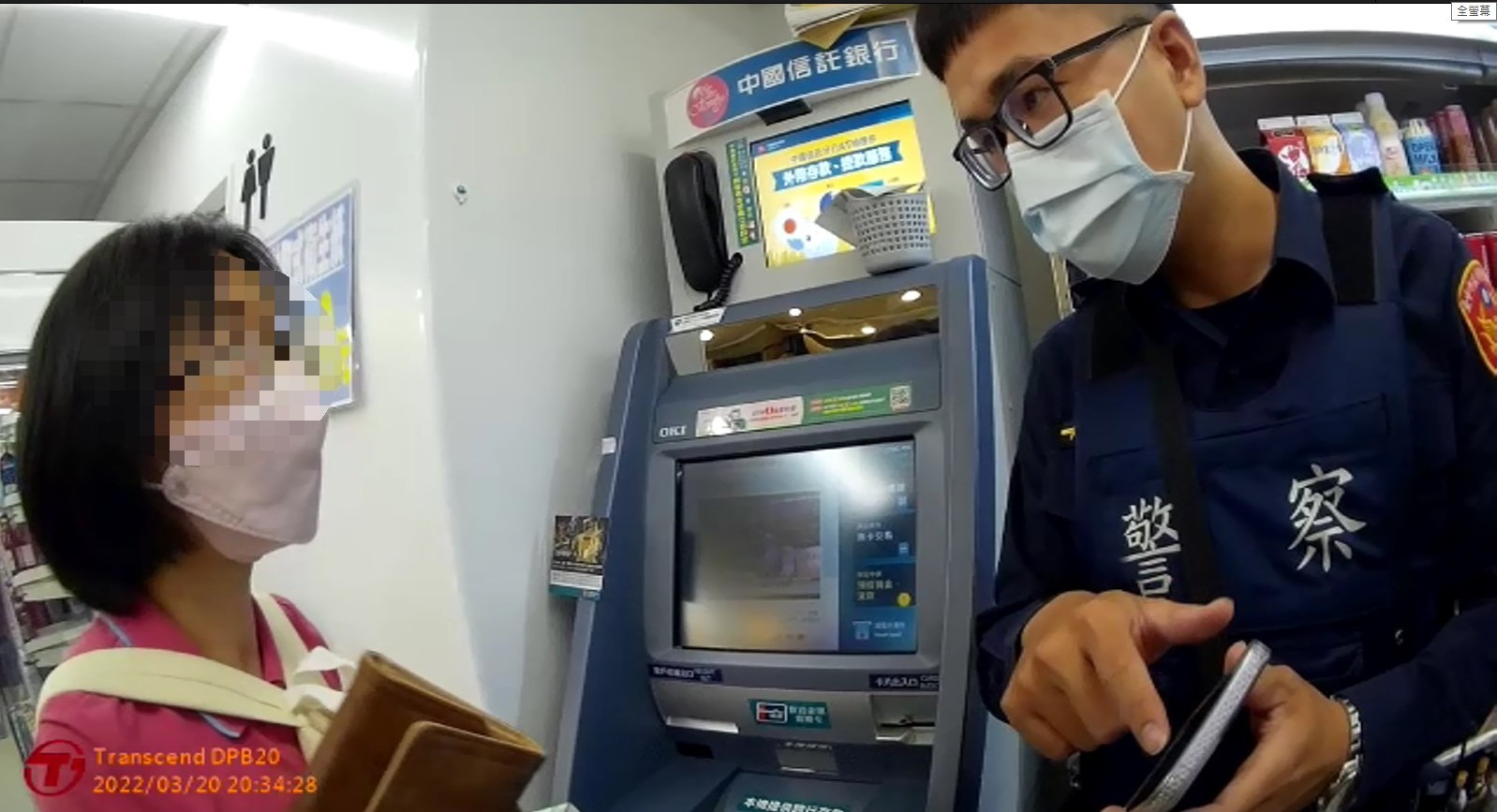 03月20日20時30分許,警方接獲超商店員報案稱店內有民眾疑遭詐騙正在操作ATM,臺中市政府警察局第二分局永興派出所警員王梓豪、楊明杰立即趕往現場,店員表示該名婦人在操作ATM時持續通話,言談中提及「轉帳失敗」、「是要轉到中國信託還是哪個銀行」等語,店員想起轄區警員告知的防詐撇步「拿手機持續聯繫」,感覺有異,於是趕緊報警求助。