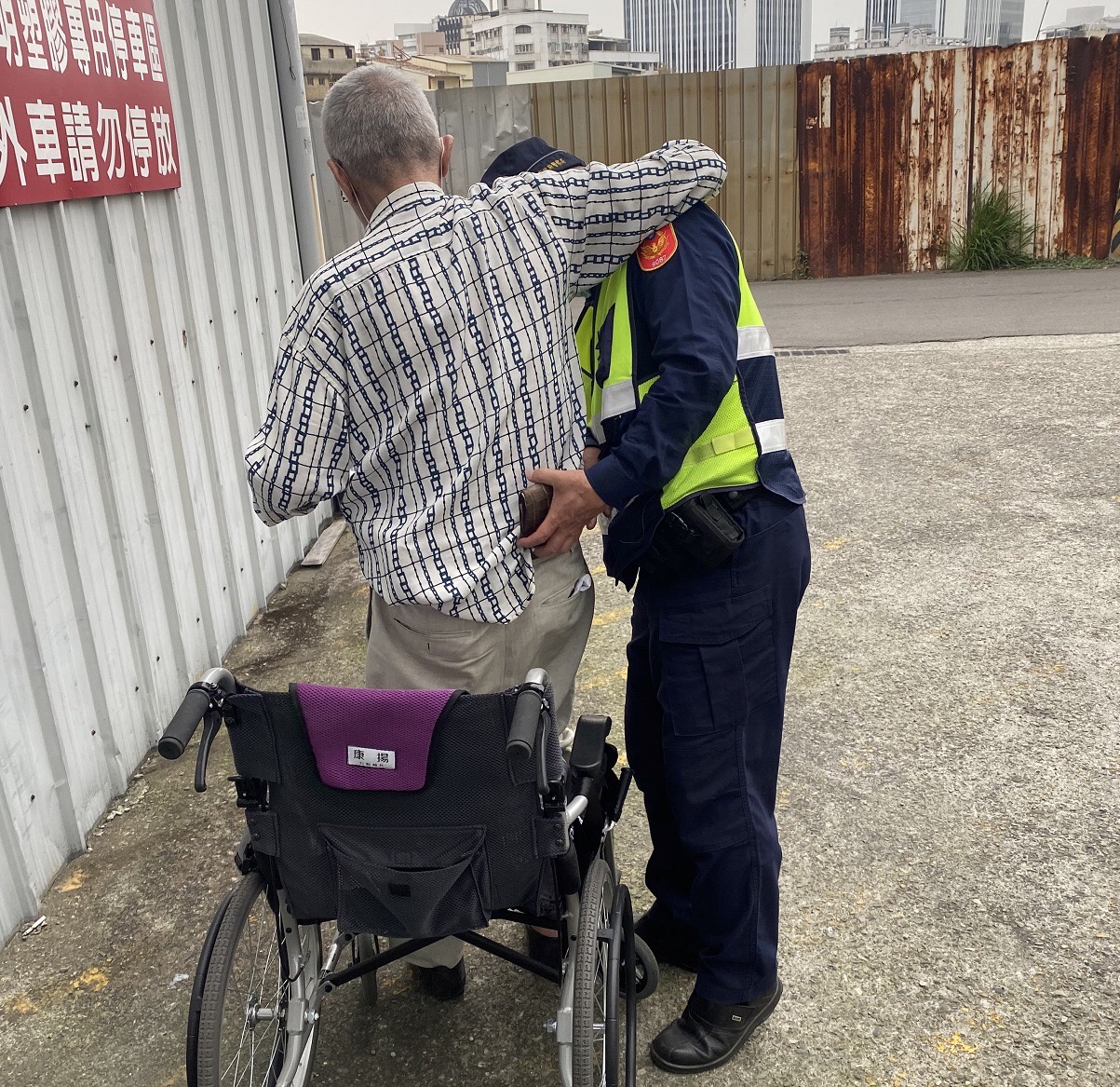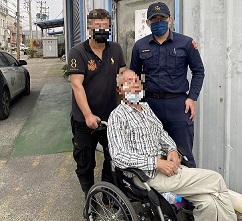 霧峰警分局成功派出所巡佐吳命獎、警員蔡淳宇於日前接獲民眾110報案,稱在大里區中興路一段26巷附近有一名老人跌坐在地,旁邊有放置一輪椅,其行動不便需要協助。