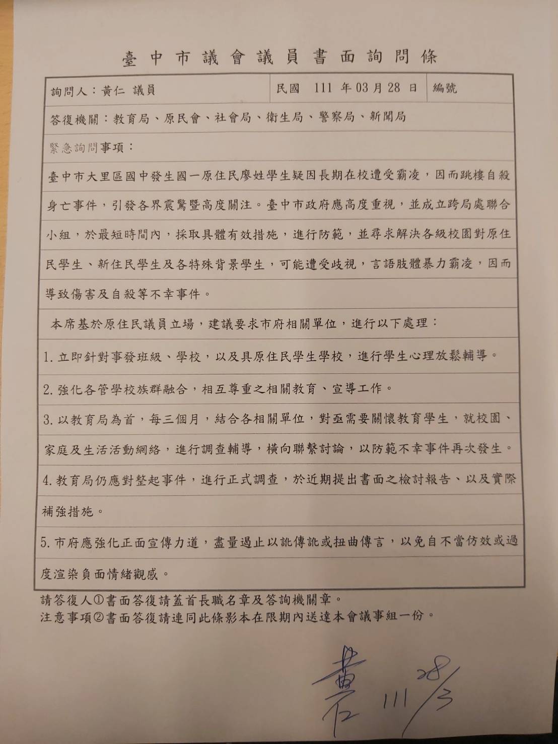 針對臺中市大里,廖姓國一阿美族學生,疑因遭到霸凌,害怕遭學校記大過,跳樓自殺身亡,臺中市平地原住民議員黃仁,於3月28日上午,要求教育局相關官員及學校校長,到議會研究室面對面進行專案說明,並針對事發經過及後續處理原則做法,進行深入討論。黃仁議員並隨即以「緊急書面質詢」方式,照知市政府相關單位,併同跨單位協助處理。但此事件也突顯先前倡議推動中之「臺中市原住民完全中學」有其設置之急迫及需要性,應儘速設校。