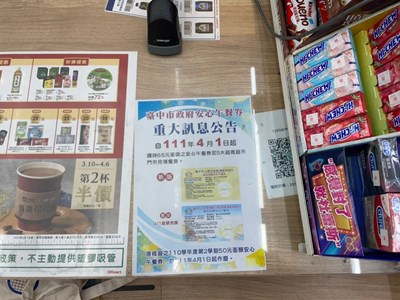 因應近期物價上漲,台中市長盧秀燕為照顧弱勢家庭並減輕其經濟負擔,於日前率六都之先宣布,自今年4月1日起,例假日及寒暑假安心午餐券面額由50元調高到65元。教育局提醒,明(1)日起原50元面額作廢不得使用,請學生持新印發65元面額的安心午餐券,在市內5大超商超市、近1300家門市兌領餐食。