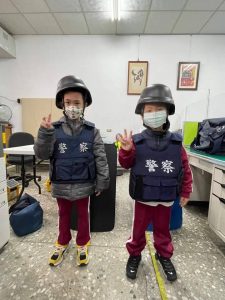 西岐派出所所長黃益全安排所內同仁,詳細地一一解釋各項警用裝備,並宣導行人交通及婦幼安全觀念,而小朋友對第一次進來派出所既驚又喜,尤其是在體驗穿上警察叔叔的裝備(防彈背心、防彈頭盔、拿著槍),異口同聲的說好重哦!當場問警察叔叔,穿上裝備這麼重,怎麼抓壞人,所長說當警察必需鍛練良好的體能,平時都要定期訓練,連帶領小朋友班導師表示自己第一次穿上警察的防彈背心、手中拿著警槍的親身體驗,也感到新奇及高興,原來真如小朋友說的很重,老師們說,我們只穿防彈背心就覺得重了,警察叔叔每天穿戴這些裝備在保護我們真的很辛苦;透過此次體驗營,小學童們原本對警察存在一種非常敬畏又怕警察的心理,一下子就融化了,原來警察叔叔這麼平易近人,異口同聲的說長大後也要當警察。