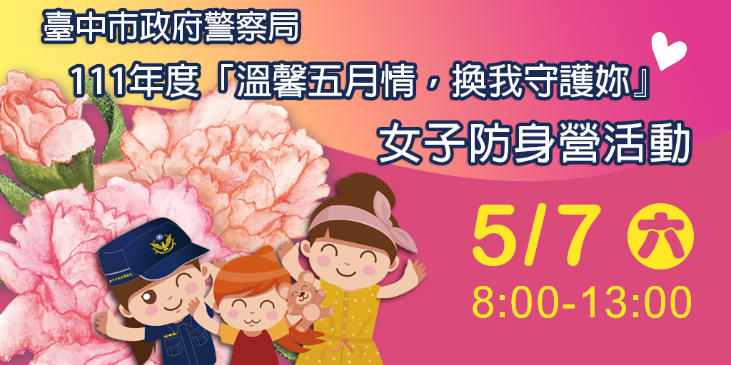 本次活動地點特別安排在警察局禮堂,並由警局教官授課,專業的氛圍讓民眾更能有效學習,現場並安排活力啦啦隊舞蹈表演及Q版警察大頭娃娃為防身營展開活動序幕,活動結束並將頒發每位學員結訓證書及本局專屬造型警報器,強化人身安全雙重保障,讓市民不僅能學習技能,更有視覺與聽覺上的雙重享受,實在不能錯過,值得您蒞臨一起同樂,活動相關資訊請上本局婦幼警察隊官網(https://www.police.taichung.gov.tw/womenchild)、臉書粉絲專頁或歡迎撥打本局婦幼警察隊電話04-25295074洽詢。