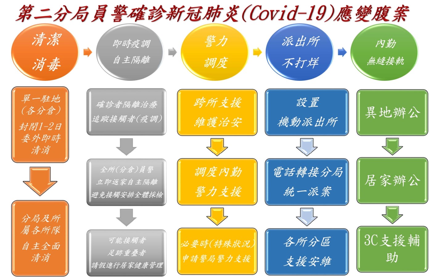 本次演練範圍包含:「外勤單位分組分流、相互支援巡邏區塊」、「內勤混和編組、居家辦公」、「每日2次清消工作」、「通信電話轉接測試」及「駐地視訊會議演練」等。藉由各單位的參與,清楚知道防疫運作過程,事先做好萬全準備,將疫情造成的傷害降至最低。