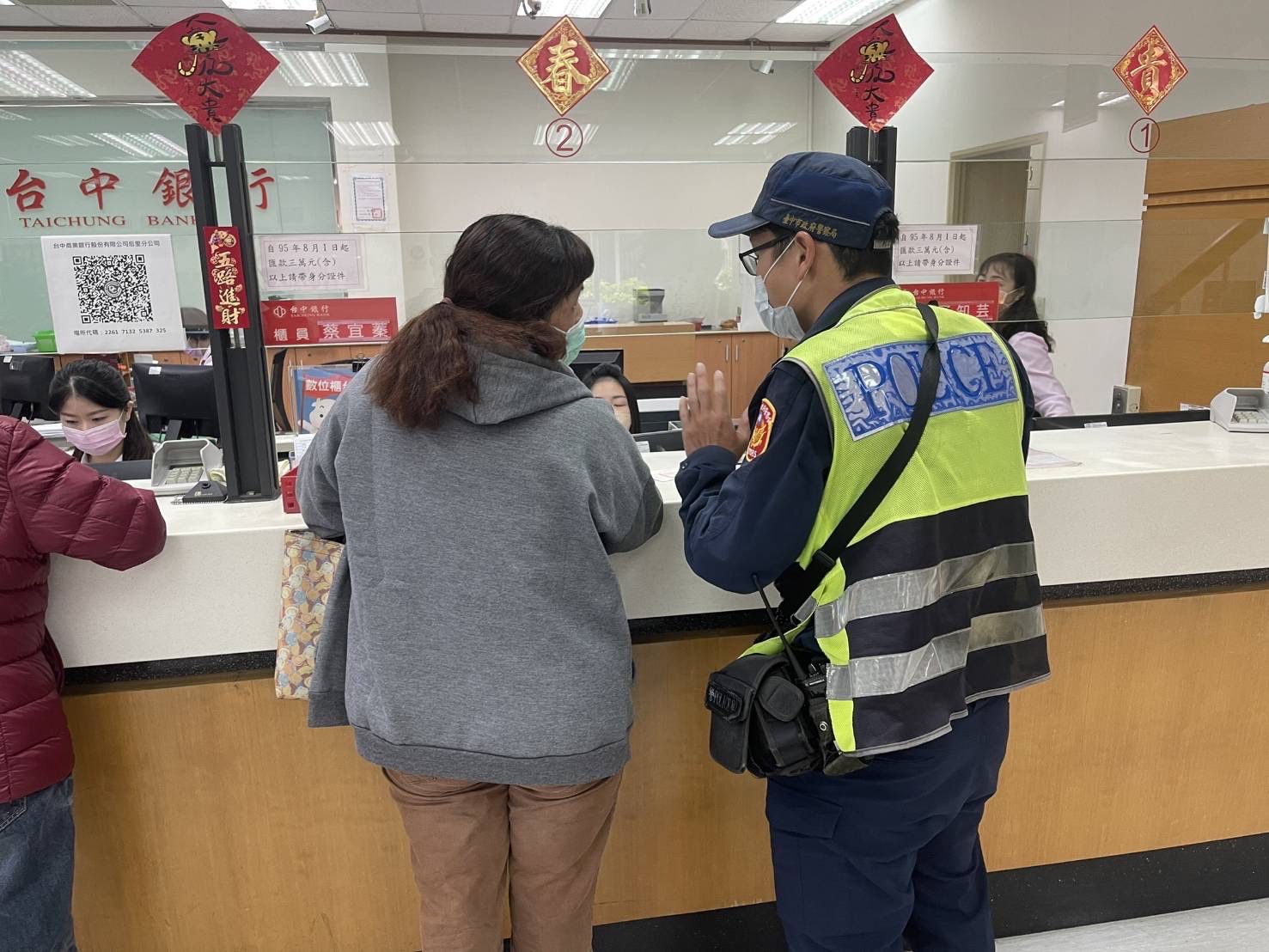 大甲警分局義里派出所,日前接獲台中商業銀行后里分行報案,指稱有民眾疑遭詐騙,警員劉泓逸、林躍宸獲報馳赴到場瞭解後,原來該名謝姓女子(58年次)口中所稱之哥哥,竟是愛情詐欺犯,在一輪甜言蜜語的轟炸下,謝女便成為了愛情的俘虜。警員除了在場苦心勸說之外並分析這為常見的愛情詐騙手法,謝女才驚覺原來這網路對話的另一端竟是居心叵測的詐騙集團,暫停匯款程序,保住10萬元的積蓄。