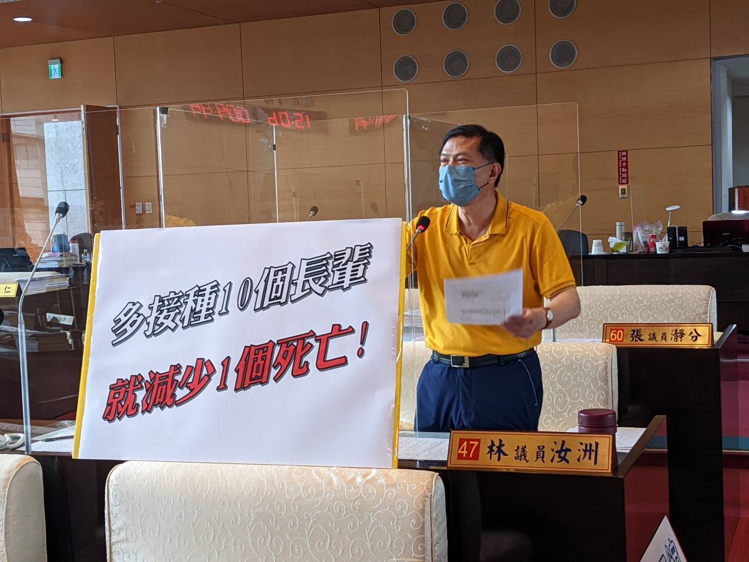 林汝洲表示,台中市75歲以上接種三劑疫苗的長者,僅有60%,現在每多接種10個長者,未來若真的疫情爆發,便能減少1人死亡。現在尚未接種的長輩,可能為不願接種,或是行動不便無法接種,希望台中市民政局能加強「到宅施打」政策,努力讓台中市75歲以上三劑疫苗接種率提升至90%。
