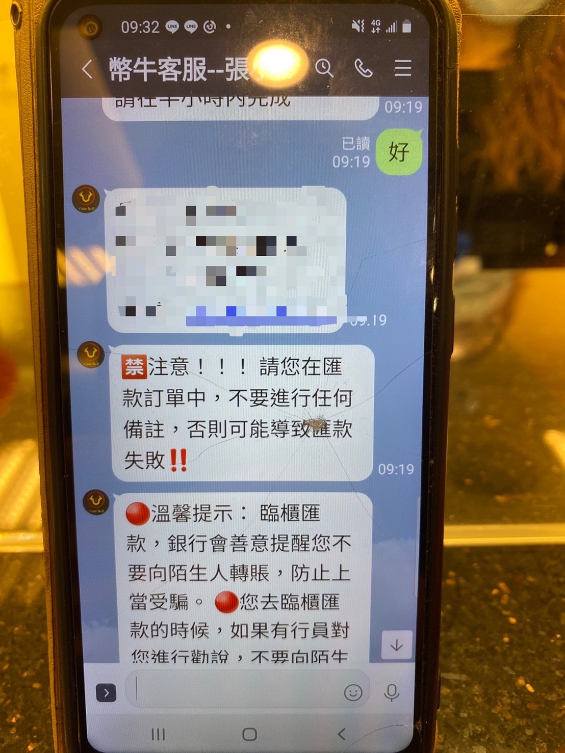 大甲警分局大甲派出所,日前接獲國泰世華商業銀行大甲分行報案,指稱有民眾疑遭詐騙,警員李鎧仲、黃加馨獲報馳赴現場,原來易姓老翁日前透過LINE加入投資團隊,隨後由張姓客服與老翁聯繫接洽,詐騙集團成員每日以「穩賺不賠」、「高報酬低風險」、「投資逆轉人生」等口號吸引目光,讓老翁深信不疑,便聽從指示臨櫃匯款。員警瞭解後,便知這是典型的虛擬貨幣投資詐騙,在分析詐騙手法時,老翁仍覺得這是財神降臨並表示這是他們的專長,而你們警察的專長就是掃黑,員警馬上接著說這詐騙集團就是黑,就是我們要掃黑的對象,所幸在員警輪番勸說及聯繫家屬到場協助之下,老翁才願意放棄匯款,事後家屬不斷的感謝行員及員警熱心的協助,才能幸運的保住積蓄。