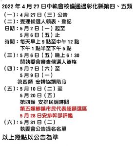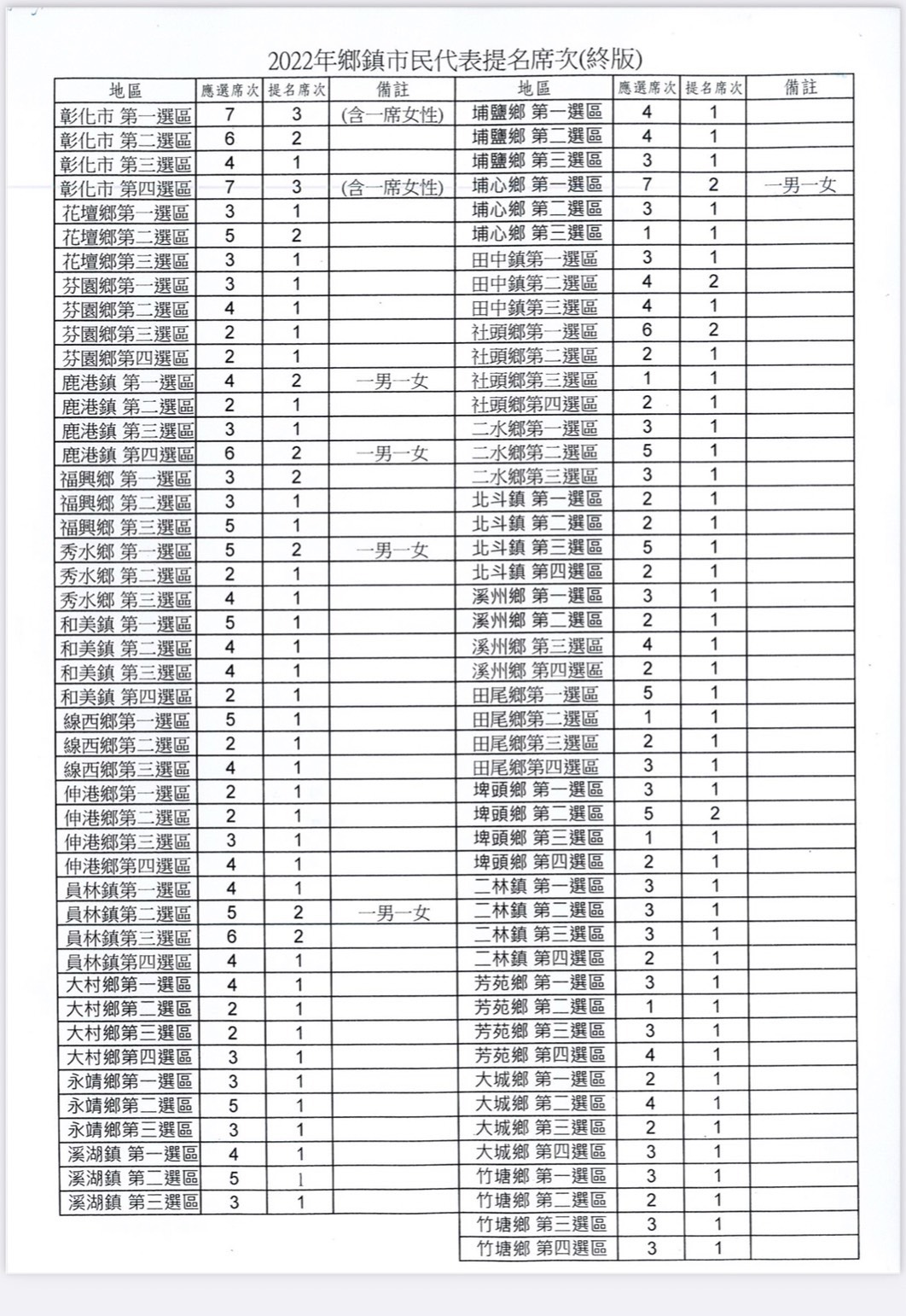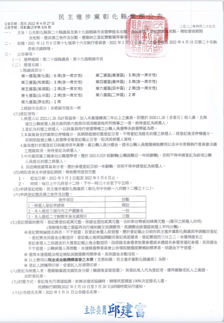 經中央核備後,民進黨彰化縣黨部正式公告縣議員、鄉鎮市長暨代表、村里長的領表、登記、協調、民調初選等相關作業。