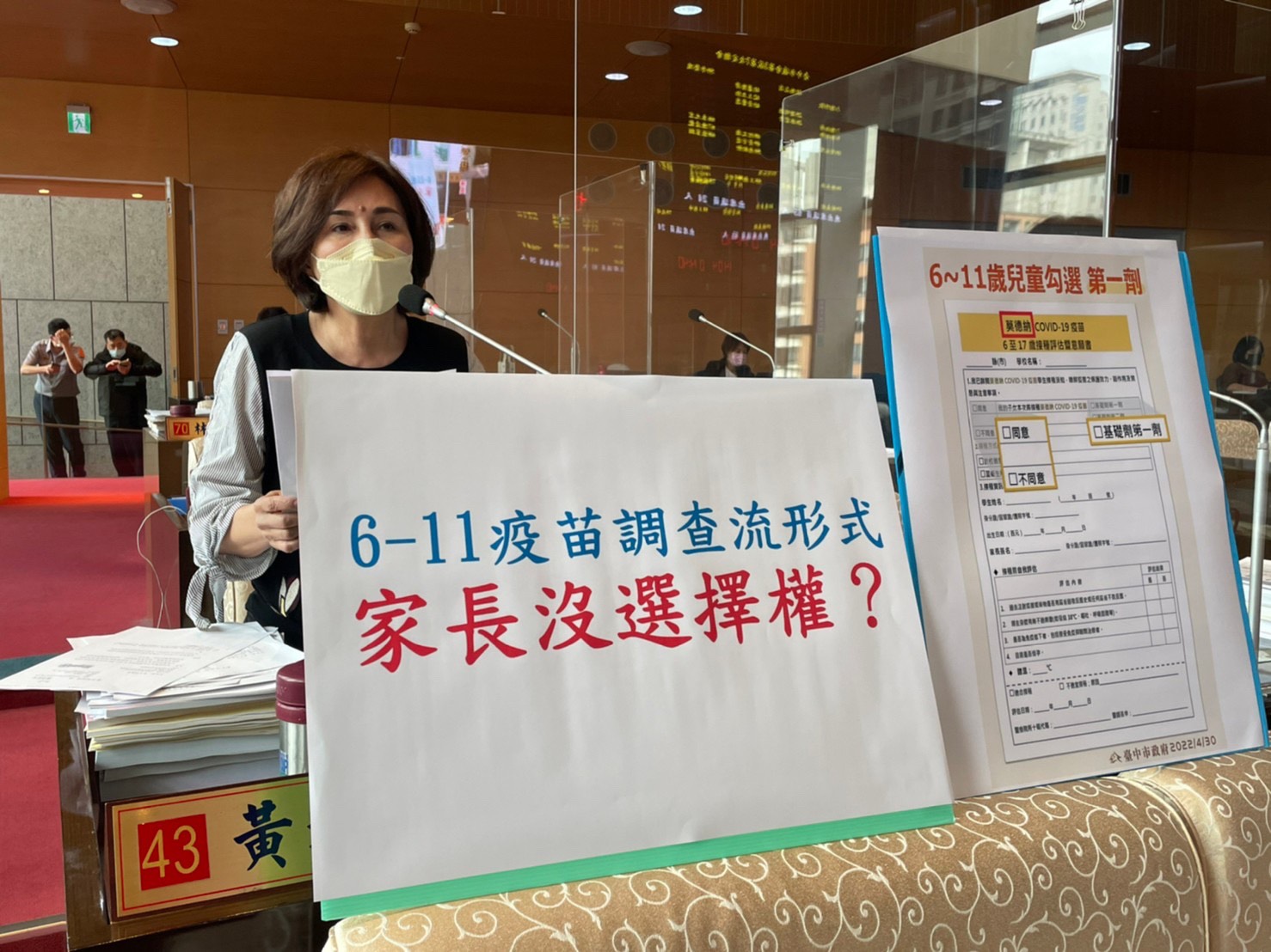 黃議員認為,為學生施打疫苗,是為了保護學生,讓家長安心。為了讓6-11歲學生施打疫苗過程更順利,台北市政策可以讓打滿三劑家長一人陪同、安撫學生,台中教育局意願調查表,有沒有調查家長陪同意願?