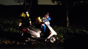 適逢梅雨時期,后里區枋寮路近環保公園處,日前晚上10點半左右,一位機車騎士因夜晚路燈昏暗,再加上下雨關係,不慎連人帶機車跌落1公尺深的大水溝內無法動彈,臺中市大甲警分局后里分駐所員警接獲立刻前往營救,讓受困在水深過膝的民眾順利脫險。