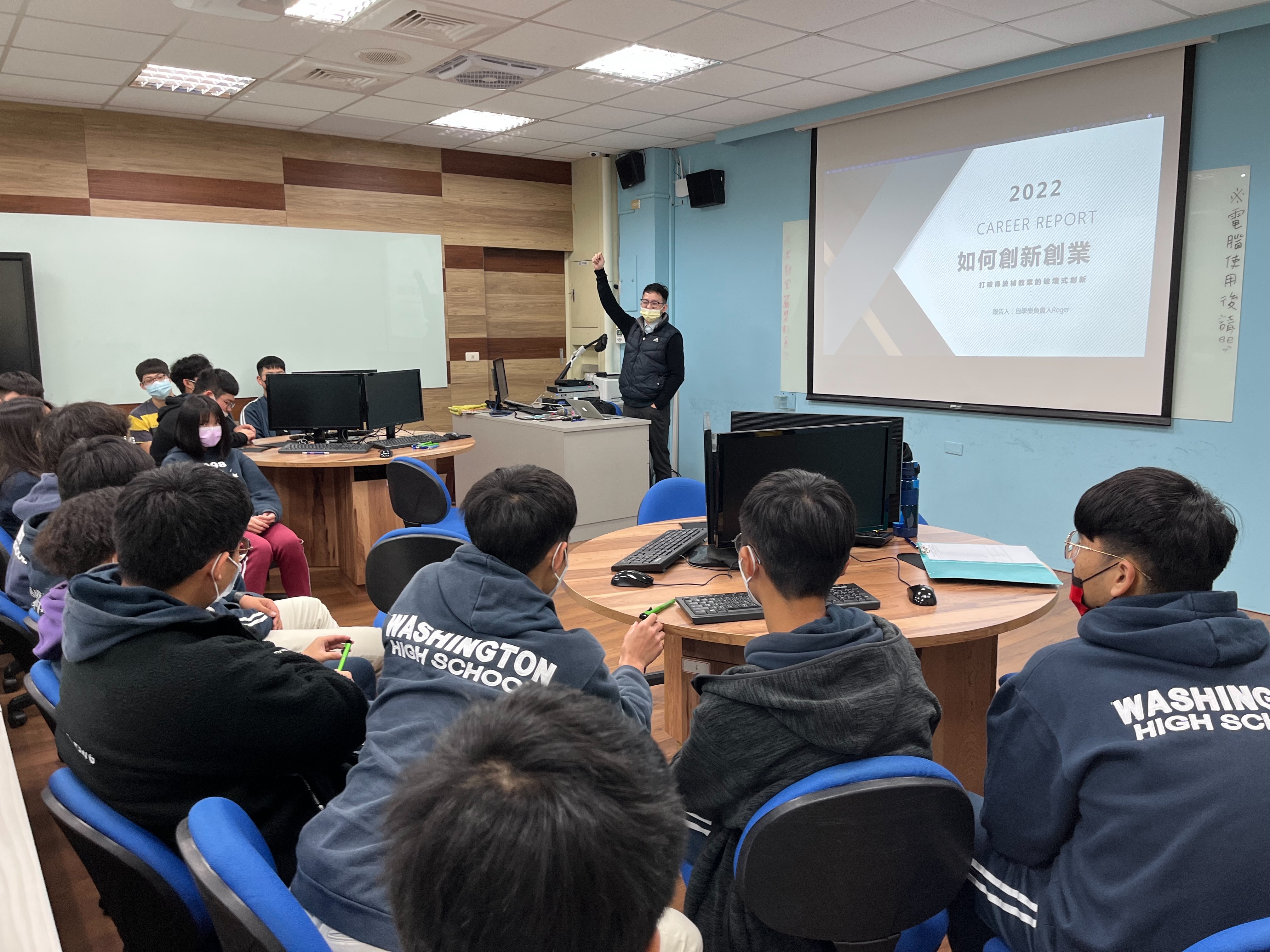 臺中市華盛頓中學國際商管課程此次邀請業界講師-自學樂股份有限公司負責人徐振傑蒞校演講,校方追求理論與實務並進,在扎實的理論課程基礎上不斷求新求變,培養學生帶得走的能力,此次徐振傑講師規劃為期四周的創新創業課程安排,和同學分享當初是如何帶領一群台師大夥伴突破自我,來場打破傳統補教業的破壞式創新,引導同學從高中開始觀察市場及職場變化,累積自身創造力及領導力,不斷進步及進化,提升人生的PR值!