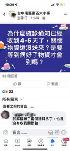 台中市議員羅廷瑋表示,自己每天都要接到近20通的電話是尚未收到的陳情,表示目前雖然市府很努力想要盡快把關懷包送到確診者的手上,但是仍舊緩不濟急。羅廷瑋表示這幾天基層里長也開始加入配送關懷包的工作,可以說是從上到下大家都在努力,但是民眾不知道現在的困境,就會造成民怨,讓台中市政府的好意變成壞意,羅廷瑋議員建議同時間也應開闢更多的遞送管道,讓確診者能夠在第一時間收到物資和政府的關懷。