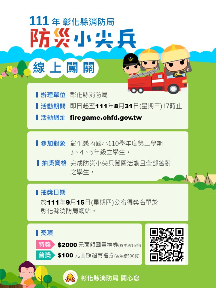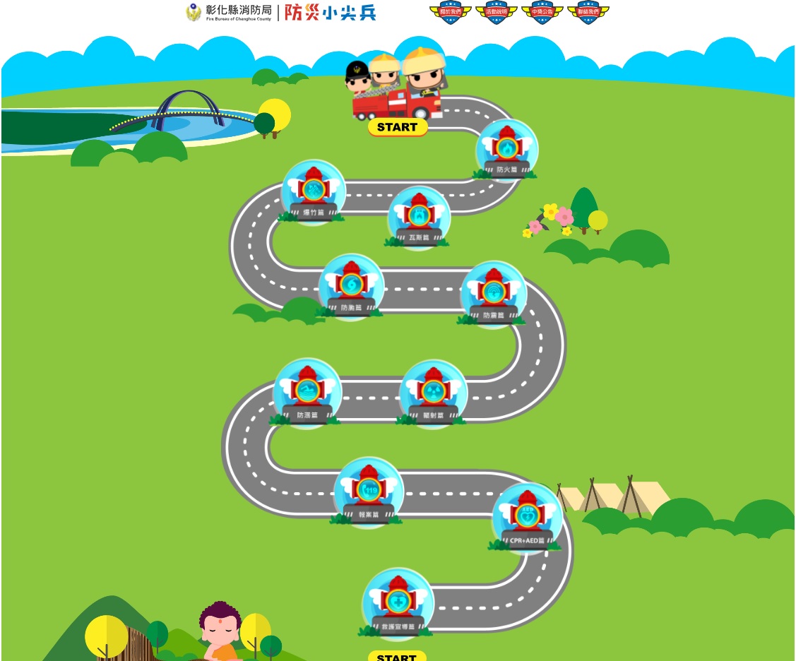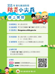 今年暑假,彰化縣消防局因應防疫期間學童居家學習,建置線上版「防災小尖兵」,透過簡單是非、選擇題的闖關方式,供彰化縣國小三升四、四升五、五升六學童暑期線上學習,引導學童從中學習更多的防火、避難逃生及緊急救護等常識與技能,使學童在家防疫期間亦能養成正確的防災知識及素養。