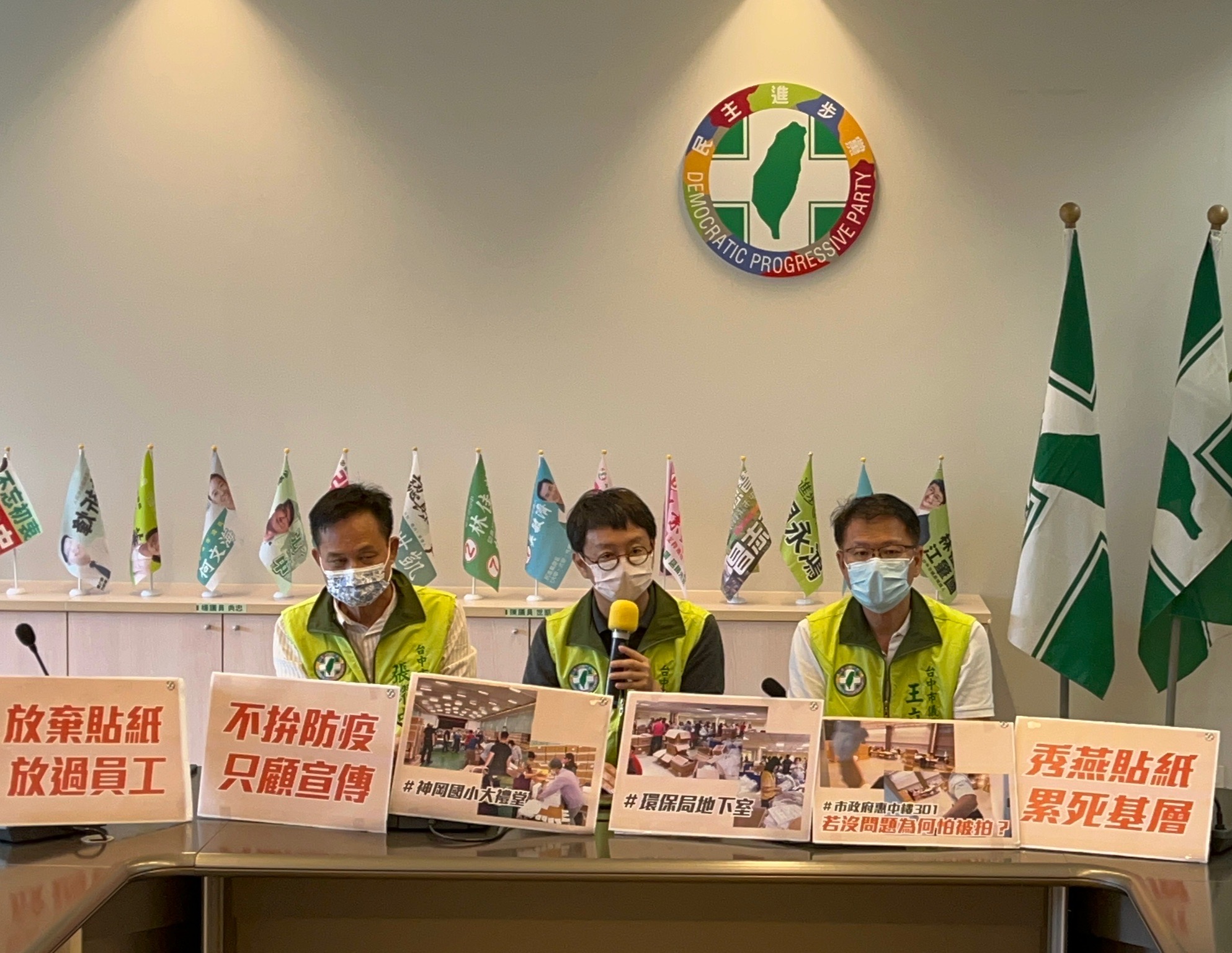 臺中市政府動員大批人力分裝快篩試劑並貼上印有市長盧秀燕名字的貼紙,對此,民進黨黨團今日召開記者會揭露,市府利用基層員工的上班時間貼貼紙造成抱怨頻頻,且除市府會議室開設大型貼貼紙工廠外,環保局地下室、神岡國小大禮堂都在趕工貼貼紙。黨團痛批,盧市府在中部疫情高原時期不拚防疫、只顧宣傳、累死基層,黨團要求盧市府放棄貼紙、放過員工,並且儘速發放快篩試劑。