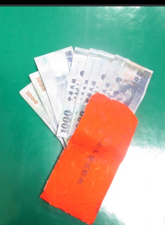霧峰警分局國光派出所於七日在轄內永大街與永隆五街口處理一件交通事故時,現場一名老人腿部受傷,現場血流不止,隨手撿了一個袋子想擦拭掉傷口的血漬,擦著擦著發現裡面裝有數千元,袋子上寫著年終績效獎金的字樣,立即將紅包交給警方發還,員警打開一看,紅包內赫然有千元鈔票七張,但袋子裡沒有任何證件,失主到底是誰,讓員警傷透腦筋。