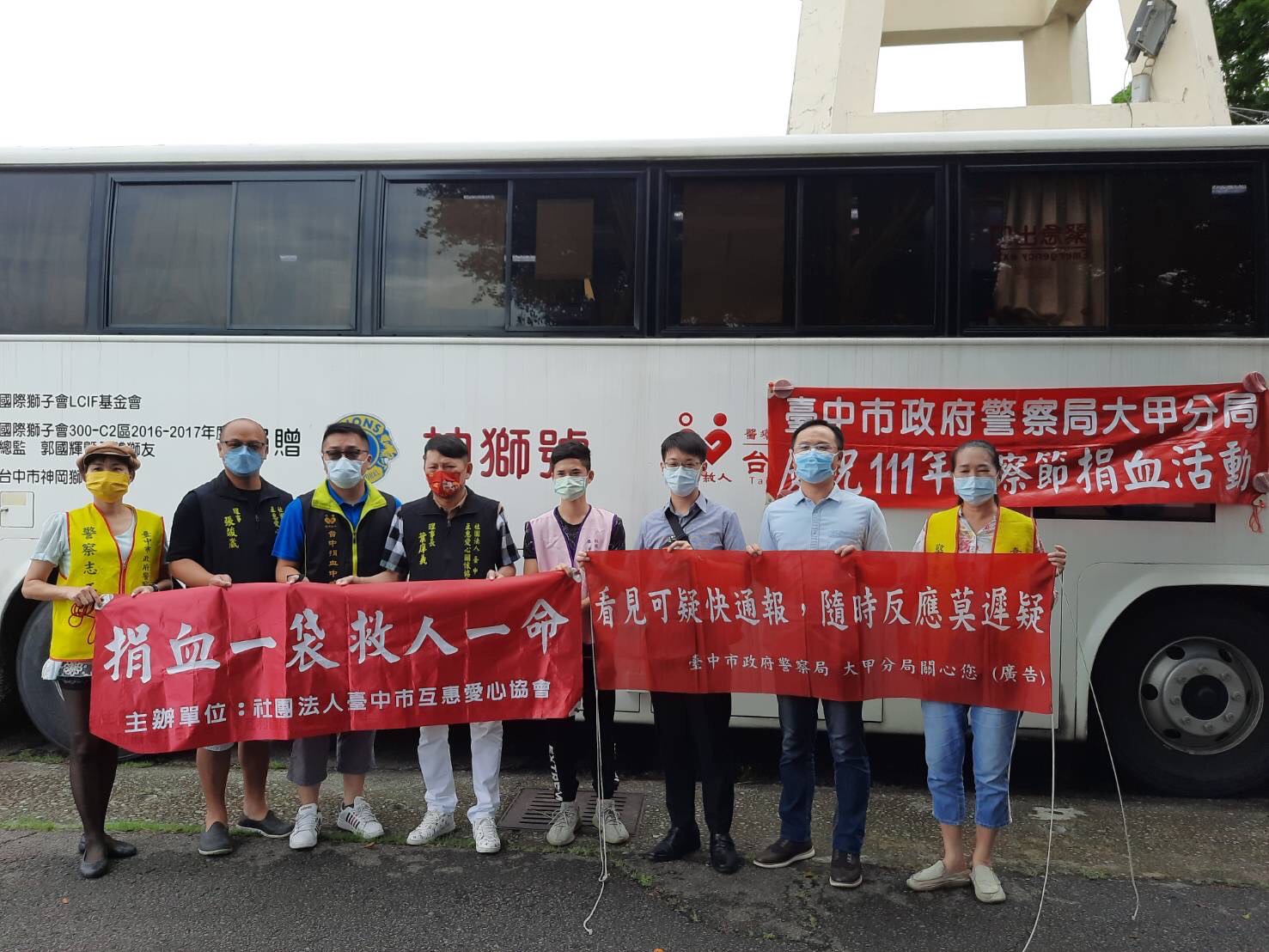 國內疫情未歇加上連日降雨,也影響民眾出門捐血意願,造成台中捐血中心以A型、B型、O型及AB型庫存量都撐不到4天。「臺中市政府警察局大甲分局」與「臺中市互惠愛心關懷協會」在大甲體育場攜手舉辦捐血活動,由警察同仁、眷屬及警察志工率先捐血外,民眾也踴躍捲袖捐血行動,血庫一口氣獲得四萬二千二百五十cc血液。