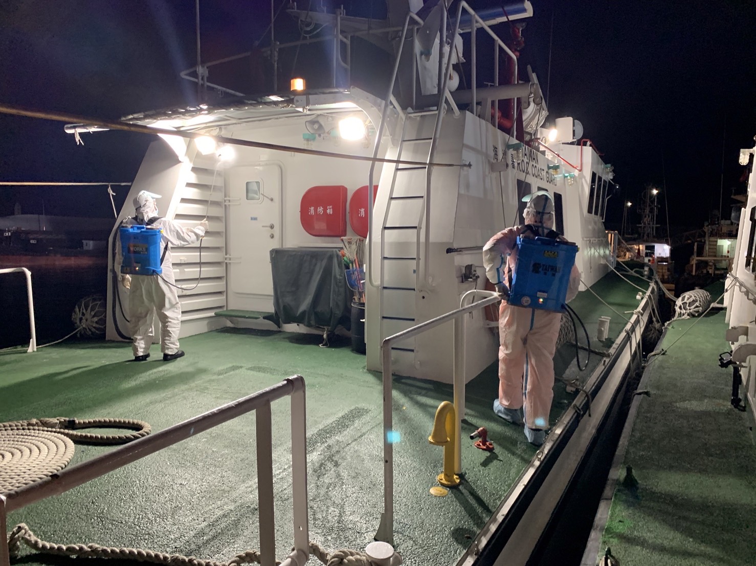 由於目前嚴重特殊傳染性肺炎與非洲豬瘟疫情有升溫趨勢,海巡人員實施登檢、扣留、留置調查等作業時,均全程穿著防疫裝備,嚴謹做好所有防疫措施,並於返隊後完成全船消毒作業。本次扣留大陸籍漁船船上人員初步量測體溫均正常。進港後將該船張姓船長及船員等4名送往梧棲「童綜合醫院」實施PCR檢測,檢測結果4員均為陰性,海巡隊依防疫規定,實施人船消毒工作,另通知行政院農業委員會動植物防疫檢疫局臺中分局派員二次清消,以防疫病境外移入。