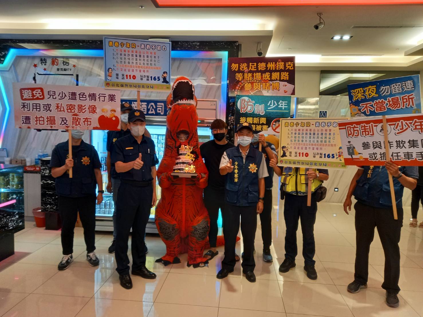 學子殷殷期盼的暑假已到來,暑假期間青少年常因為好奇、追求刺激,容易受到有心人士的誘惑,從事非法行為或聚眾危險駕車等情事,彰化警察分局於111年7月9日針對轄內少年易聚集危險駕車路段、深夜易留連之KTV、撞球館、PUB、夜店、限制級電子遊藝場等營業場所及轄內治安要點處所,執行防制危險駕車、擴大臨檢及保護兒少專案,9日晚上並與彰化縣警察局少年警察隊於轄區民生路知名KTV實施青春專案宣導時,巧遇同學用心裝扮恐龍造型至KTV唱歌慶生,尤其花費壹萬餘元的紙鈔生日蛋糕,瞬間吸引眾人目光,當下邀請超萌恐龍小妹加入宣導行列,加強宣導暑期青少年自我保護觀念,並藉由擴大臨檢使不法分子知難而退,淨化轄區治安,展示暑假期間保護青少年安全之決心,也讓民眾有更優質的治安與交通環境。