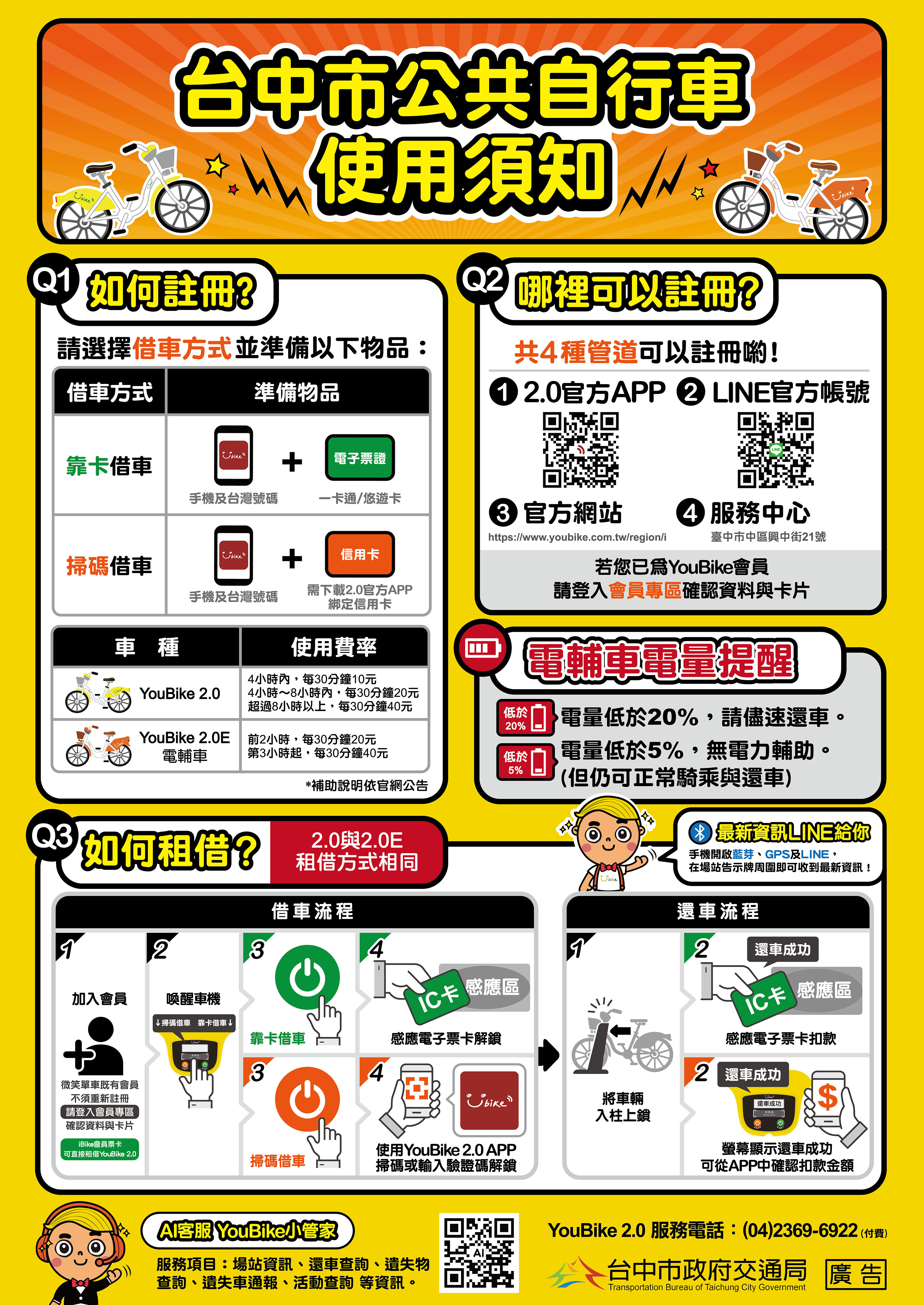 為提升公共自行車服務,臺中市導入「微笑單車2.0電輔車(YouBike 2.0E)」,透過電力輔助讓騎乘時可以更輕鬆、省力,YouBike 2.0E租借方式與2.0相同,可透過「電子票證」或「手機掃碼」借車,市府也將持續加速設站,提供優質的公共自行車服務,以達到「交通任意門」。