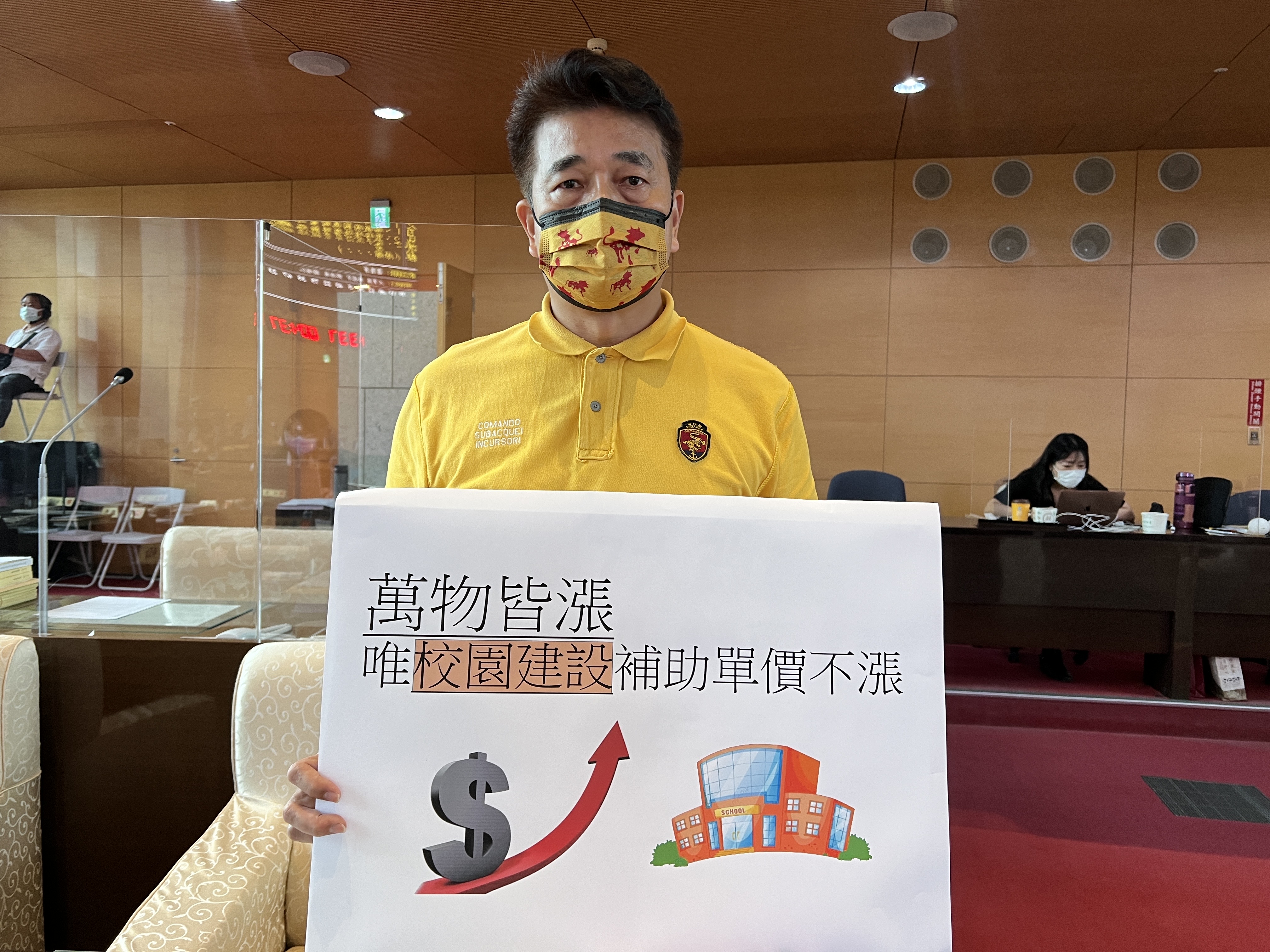 市議員陳廷秀說道, 108年國教署核定校舍建築單價每坪85950元,111年上半建築成本每坪現在漲到13萬9770元,每坪漲了5萬多,補助的單價卻一直沒有提升,工程建設方面造成地方很大的困擾,也因為這樣,校園建設也都停擺,校園工程流標,縱然順利標出,也需減項發包,變成陽春建設,一切都不符我們照顧學子的原意。