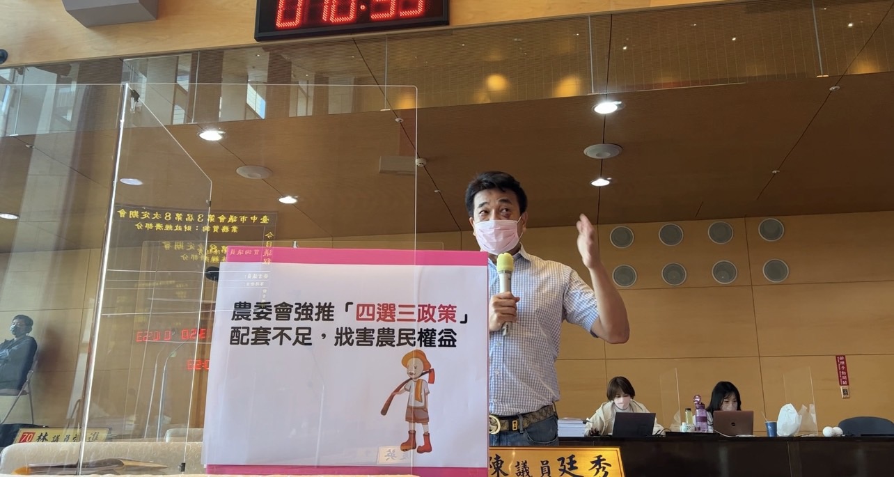 市議員陳廷秀說,現在物價上漲,但稻穀收購價格卻完全不漲,海線老農多數都是靠政府公糧收購,才能維持基本生計,而休耕1公頃只補助3萬4,加上整地費用根本剩沒多少,現在又說不休耕要取消公糧收購,感覺像在強迫農民休耕,很不合理。稻作四選三政策,以2年、4期稻作為一循環,稻作只種3期,盼以此減少公糧過剩與改善稻價問題,但對此有農民質疑,需被迫休耕,減少收入感到不滿。