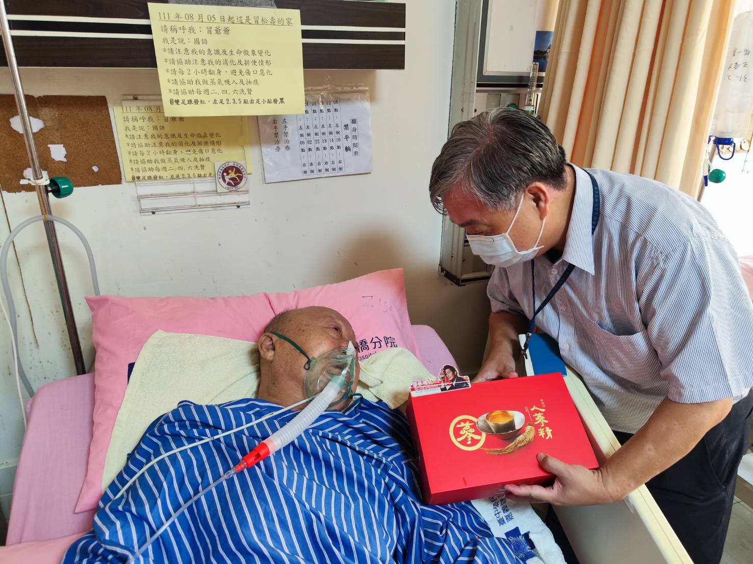 為向住院的榮民伯伯們傳達輔導會的關懷及問候,彰化縣榮民服務處總幹事丁俊特別於農曆秋節前夕至臺中榮總嘉義分院關懷年長住院榮民,除致贈人蔘精禮盒並與伯伯們溫馨問候,表達榮服處深切的關懷之意,也預祝長輩們佳節愉快、身體早日康復。