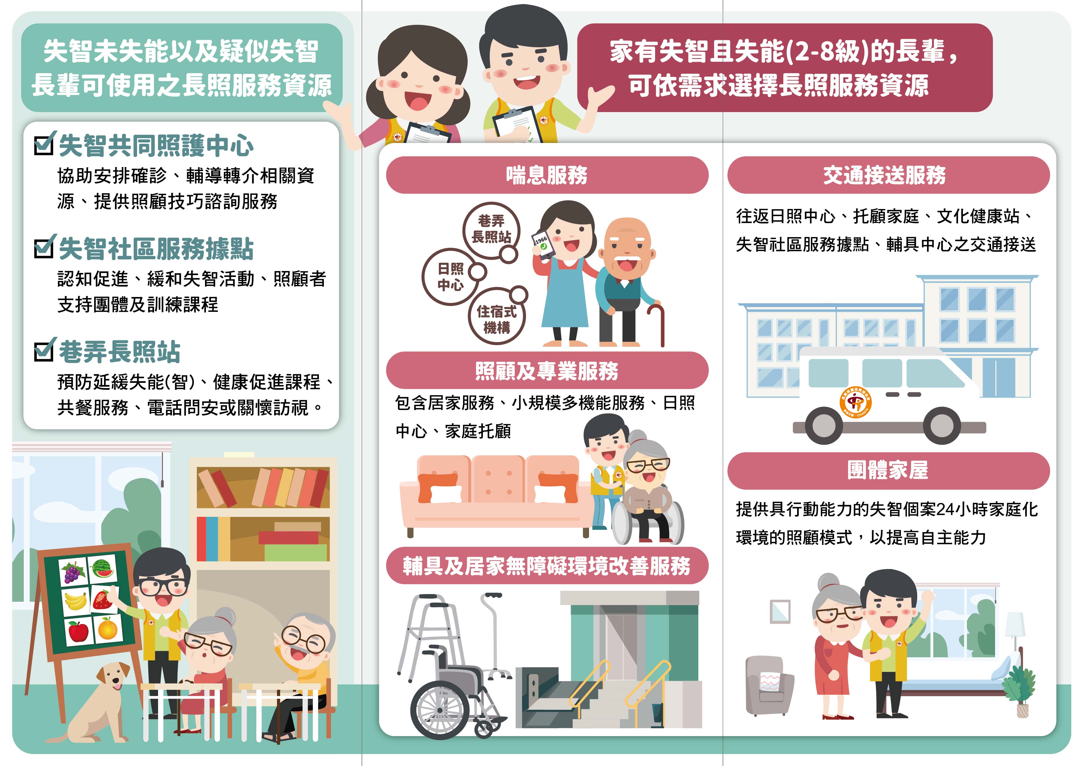 為維持失智症者身體照顧、認知促進、社會參與等,延緩失能及退化,長照2.0擴大服務對象含50歲以上失智症者,可透過長照服務申請,由照管專員到府評估,失能等級達2-8級者,可使用多元服務,如居家服務、日間照顧、家庭托顧等照顧服務;亦可透過專業服務到府指導居家照護技巧及認知訓練。