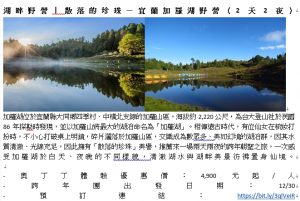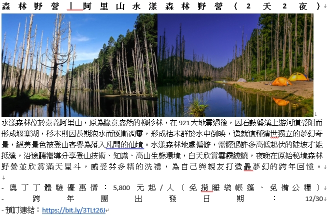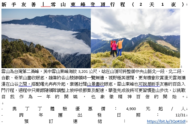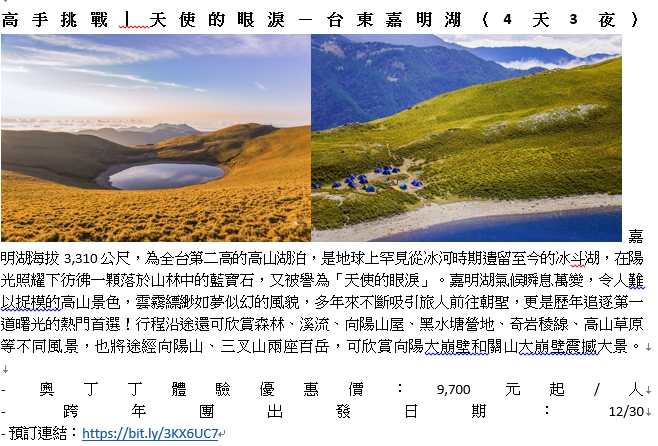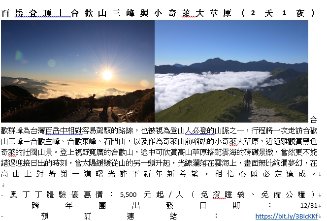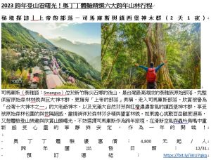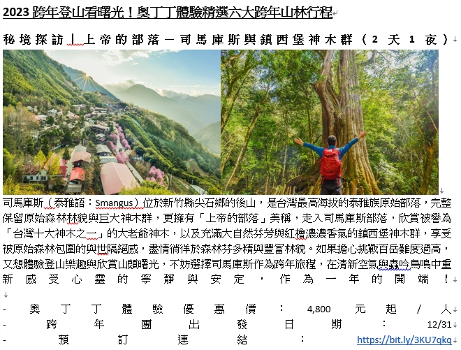 奧丁丁集團行銷業務代表翁佩甄表示:「過往這些山林行程跨年檔期每年甫開放便吸引民眾搶訂,因此今年我們提前開設登山跨年專區,並集結新竹司馬庫斯、合歡山群峰、台東嘉明湖等站上熱銷行程,以及南投郡大山與獵人古道、宜蘭南澳神祕湖等新興地點,無論是登山新手或山林老手都有合適行程可選擇,更提供限量折扣碼,推薦民眾於歲末年終走訪山林,登頂欣賞第一道曙光與層層雲海的壯麗美景,作為迎接 2023 嶄新一年的開端。」