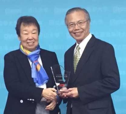 「Cheers」雜誌在臺大醫院國際會議中心舉辦頒獎典禮暨調查發表記者會,邀請前教育部長鄭瑞城與天下雜誌群創辦人暨董事長殷允芃共同擔任頒獎人,中國醫藥大學由吳永昌副校長代表接受「天下雜誌」發行人殷允芃頒獎合影。