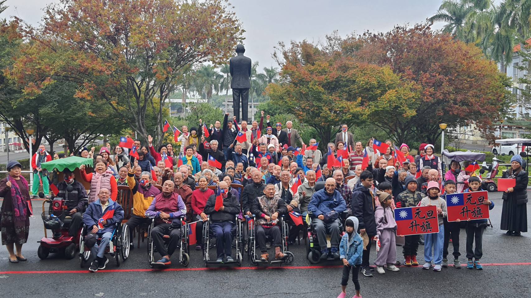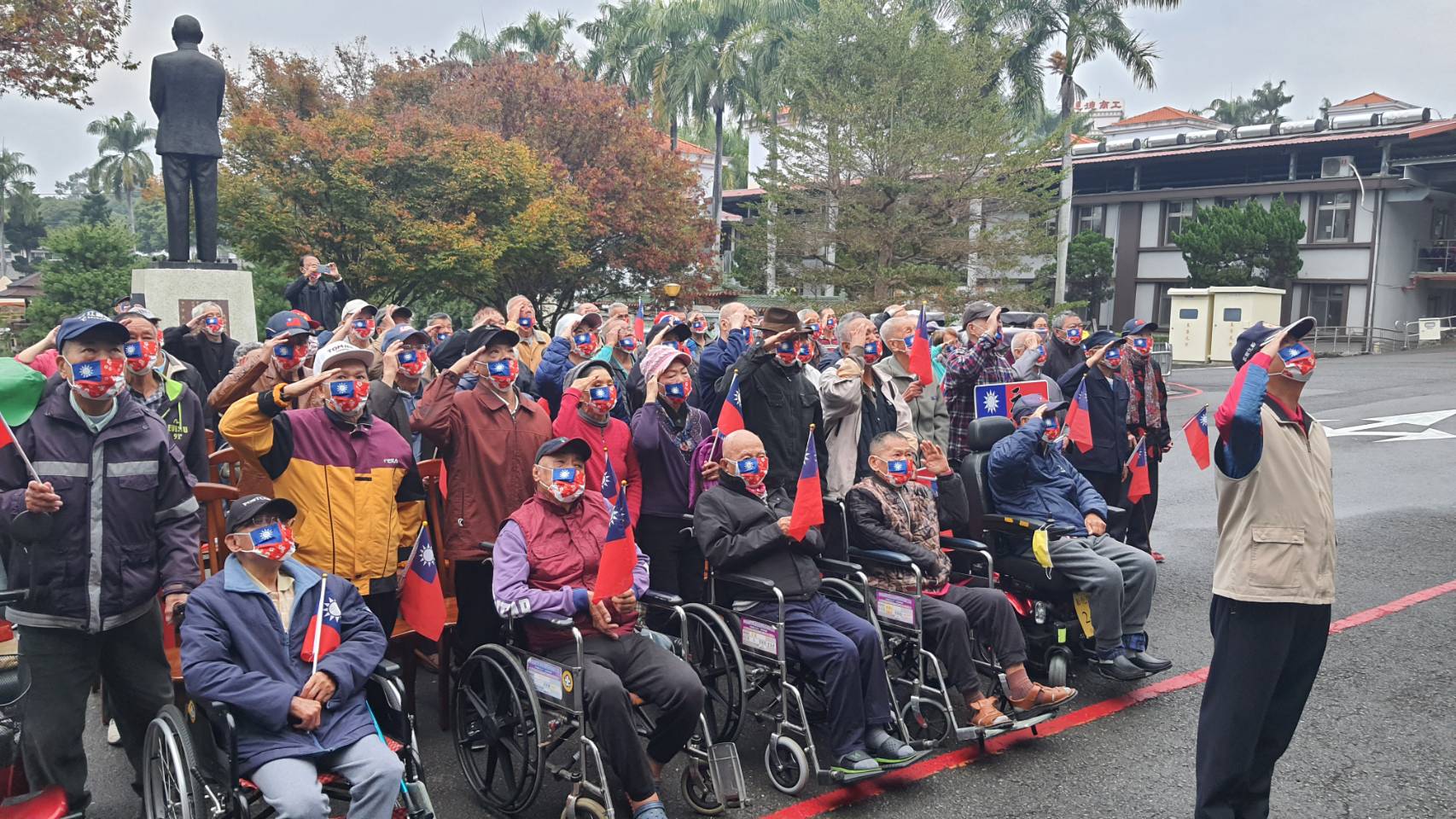 111年是紛亂的一年,在烏俄戰爭、COVID-19 疫情等陰影壟罩下,全球局勢動盪不安,但這些都澆不熄榮家長輩愛國的心,清早戴著國旗口罩,紛紛持小國旗來到行政大樓前等候,養護堂長輩雖不良於行,也精神抖擻地乘坐輪椅熱情參與。