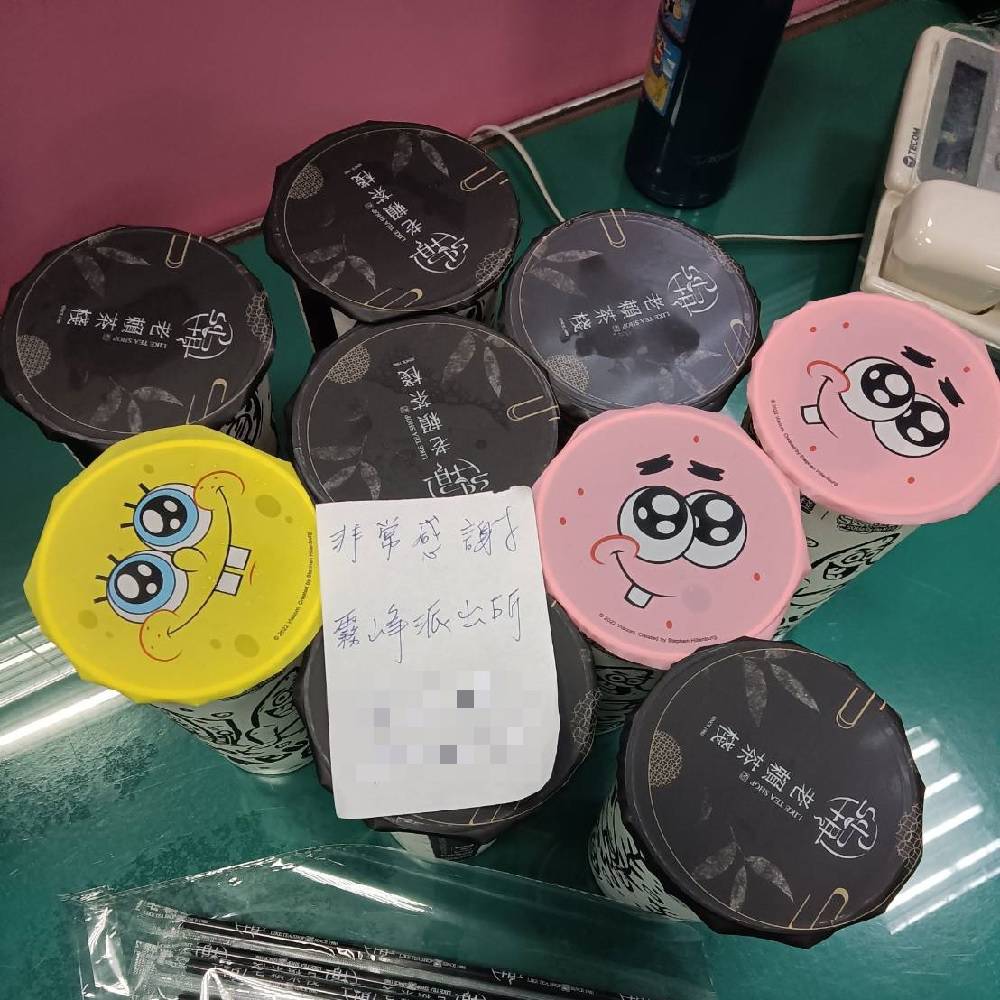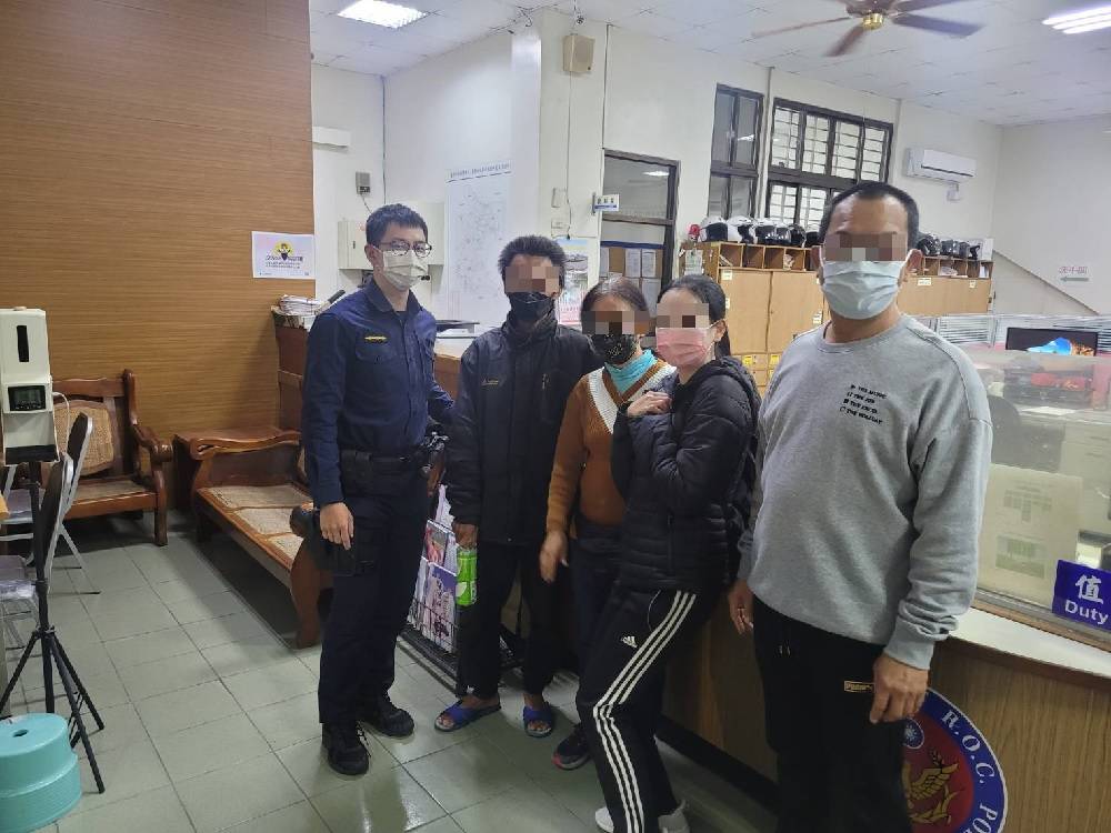 李男家屬從台南趕上來,見到李男十分健康有精神,感到非常開心,也很感謝熱心員警協助平安返家團圓,特別送上飲料慰勞警察的辛苦。