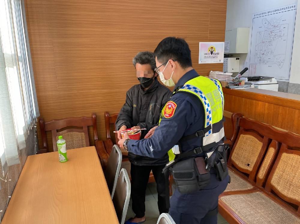 經了解,李男設籍在台南市,不知何種原因、用何種方法來到台中,員警詢問有無熟識親友住在附近,李男皆無法回應,只好透過戶籍地社會局協助聯繫家屬,因其家屬遠在台南,無法第一時間趕到,員警擔心他飢寒,主動提供熱騰騰泡麵食用,寒冬生暖意使人溫馨。