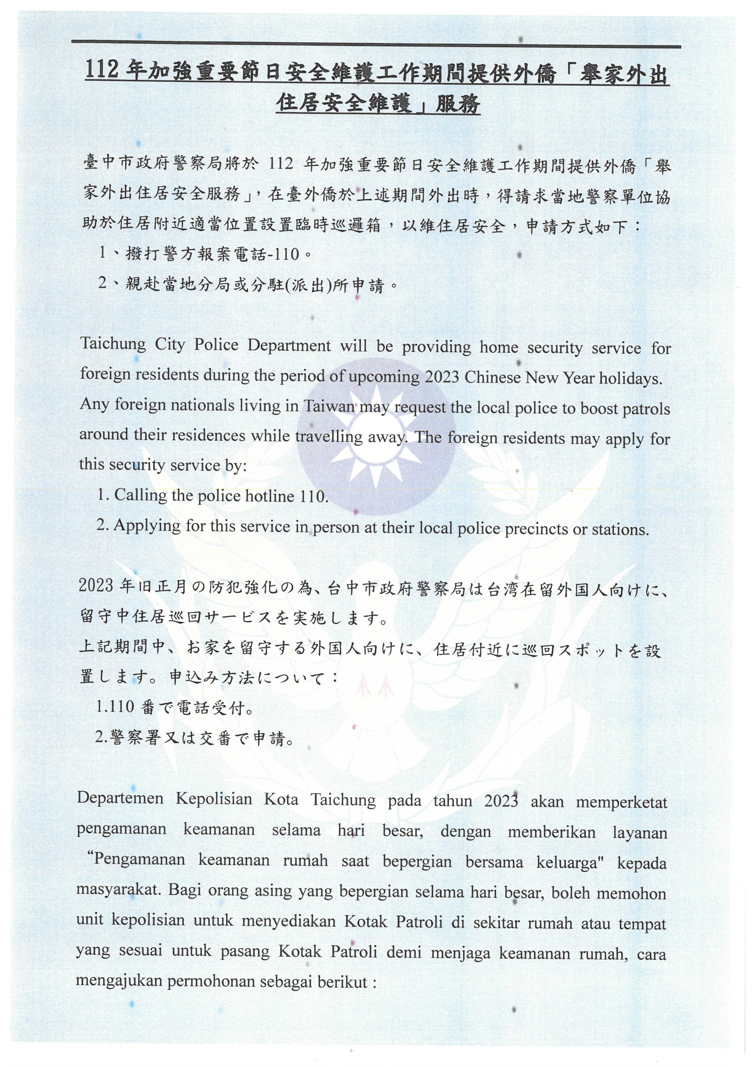臺中市政府警察局在去(111)年春節期間,總共接受593位市民及外僑舉家外出住居安全維護的申請,並圓滿達成守護任務,深獲申辦民眾與外僑的好評與讚許。今年更擴大服務深度與範圍,製作英文、日文、印尼文、越南文及泰文等5國語文宣導單,好讓外國僑民在臺灣春節連假期間,也可以安心返國度假。