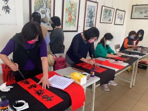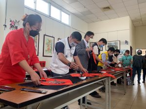 春節將至,嘉義市文藝作家協會今(14)日在嘉義市交通轉運站2樓舉辦「歲末迎春名家贈春聯」,現場邀請展會貴賓一同揮毫寫下祝福,嘉義市政府社會處長、交通處長及文化局長也一同參與,迎春納福。20位書法名家現場揮毫超過500幅春聯贈送給旅客和民眾,以及3位茶藝師設茶席迎賓,展現自身藝文專長,服務社會。