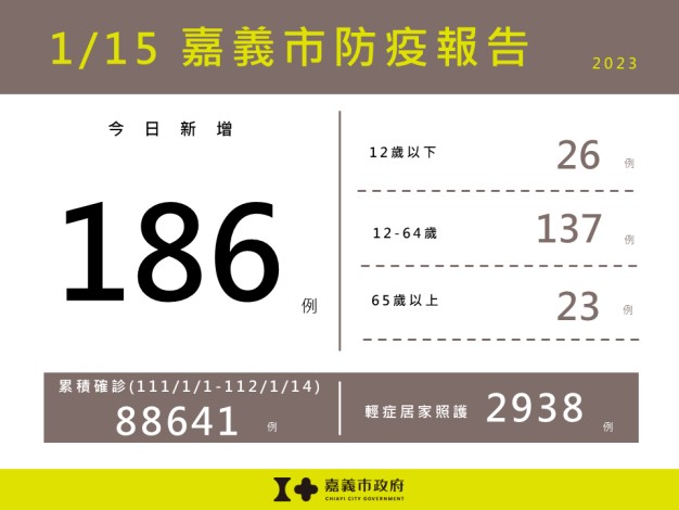 嘉義市地方新聞嘉義市新增186例本土確診案例 榕嫻3 年 ago3 年 ago01 mins 【環衛新聞記者劉奕連報導】 中央流行疫情指揮中心今(1/15)日公布嘉義市新增186例確診個案,包含12歲以下26例,12-64歲137例,65歲以上23例。嘉義市目前輕症居家照護人數2,938人。111/1/1截至112/1/14嘉義市累計確診嚴重特殊傳染性肺炎本土病例數為88,641人。 文章導覽 Previous: 東勢警分局結合民間善心春節前夕送物資讓長者暖心Next: 嘉邑行善團助學金助114名優秀弱勢生逆境追夢 市長勉勵學子盼形成善因循環 發佈留言 取消回覆發佈留言必須填寫的電子郵件地址不會公開。 必填欄位標示為 *留言 * 顯示名稱 * 電子郵件地址 * 個人網站網址 在瀏覽器中儲存顯示名稱、電子郵件地址及個人網站網址,以供下次發佈留言時使用。