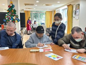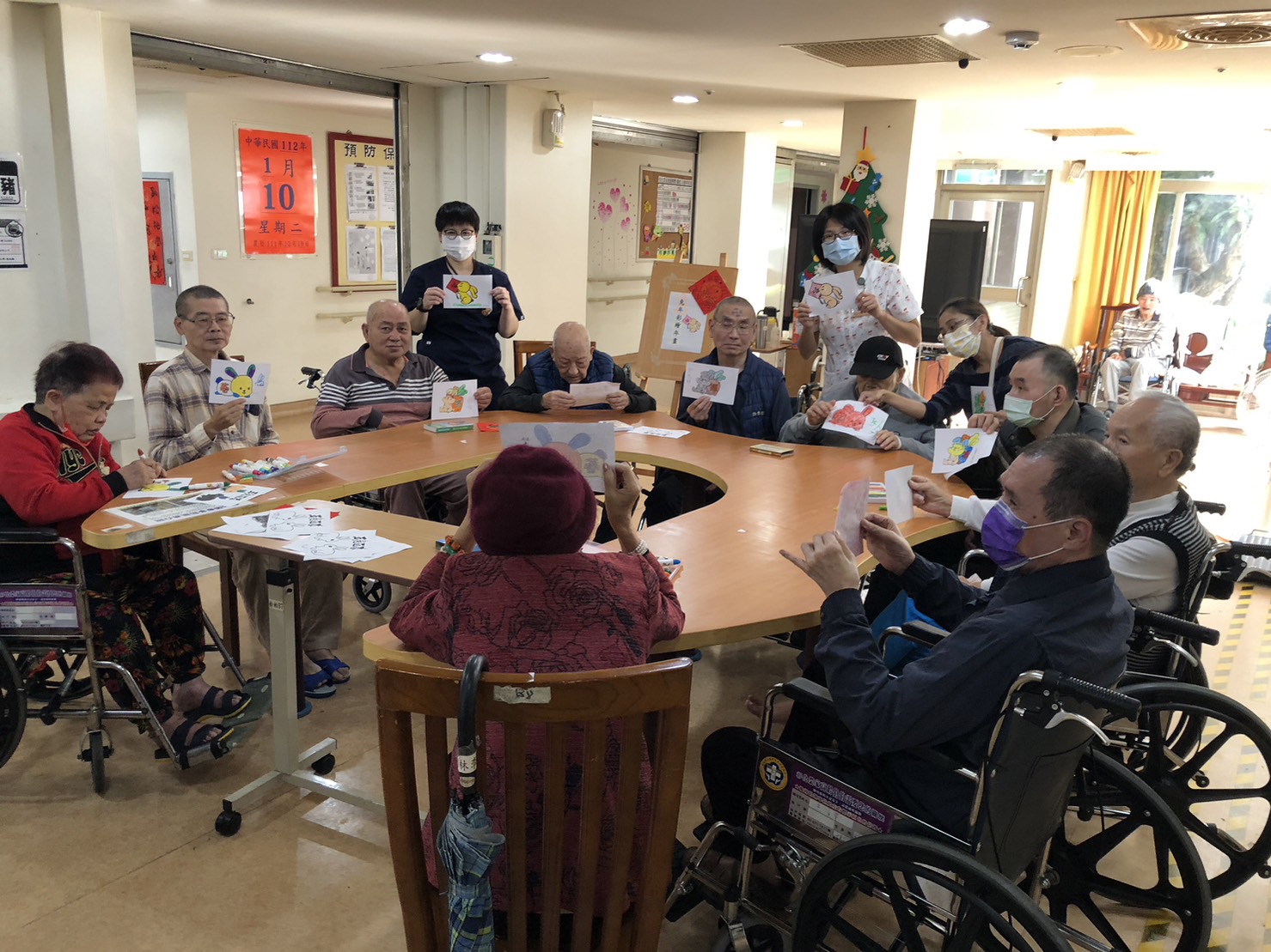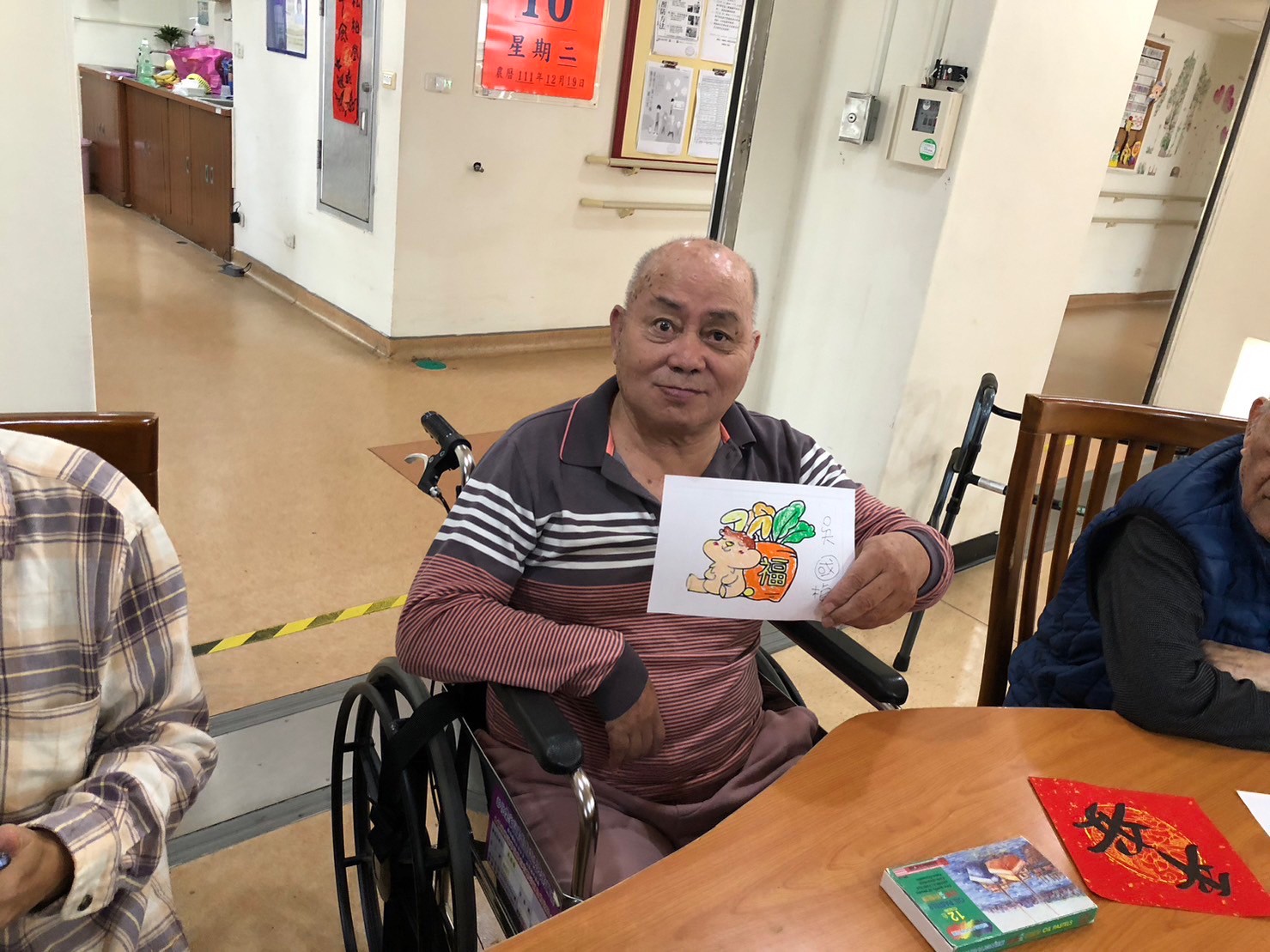 年輕的冠宏選擇玉兔迎春來畫,邊畫邊說春來兔來,兔年行大運;百歲的大發伯伯選福氣兔,希望大家都可長命百歲;阿滿姨選有2隻兔子的玉兔迎春代表跟先生雙雙對對;藝術家氣質的英妹阿姨發揮他特有的剪紙專才,把兔子剪下來後佈置在牆上,大家看著自己完成的作品都露出滿意的笑容。