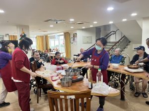 在長輩們忙著畫畫時,一旁的工作人員則認真煎粿,讓大家品嘗農曆年特色的美食-菜頭裸,吃得好彩頭一整年,香味四溢的蘿蔔味搭配充滿春節氣息的音樂,營造出濃郁的過年氛圍,希望讓長輩們在榮家也能感受到像在家的年節氣氛!