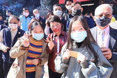 喜迎兔年,今(22)日是大年初一,台中市長盧秀燕上午前往東區樂成宮、東區南天宮、中區順天宮輔順將軍廟、烏日區東女慈聖宮發送印有「錢兔似錦」的市長小紅包。今年小紅包採兔耳朵探出頭的立體設計,象徵新春到、新年到,祝大家新的一年輝煌燦爛,財源滾滾來,吸引許多民眾一大早排隊討吉利。盧市長開心與市民家人合影,並許下國泰民安、市政昌隆、市民闔府安康等3個願望。